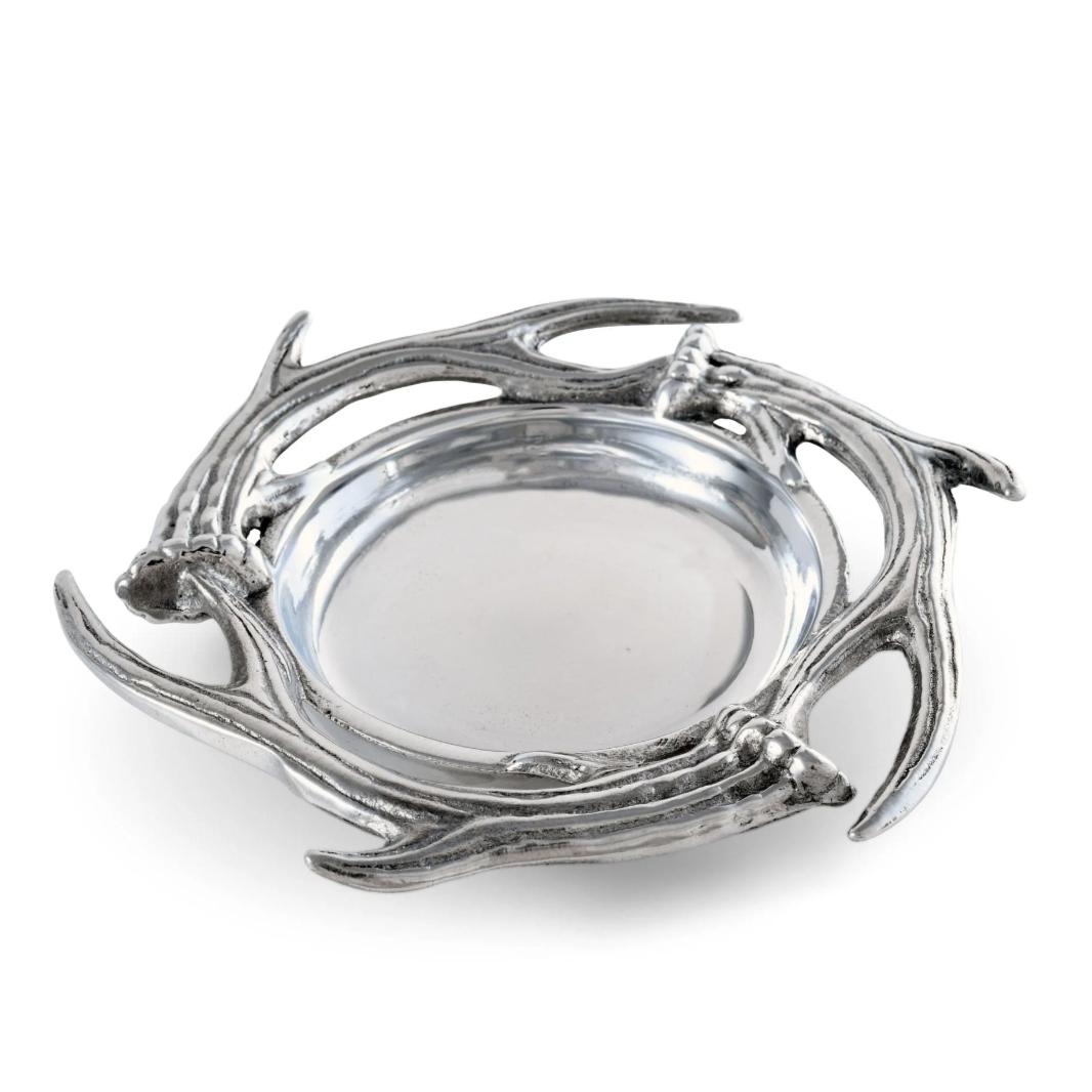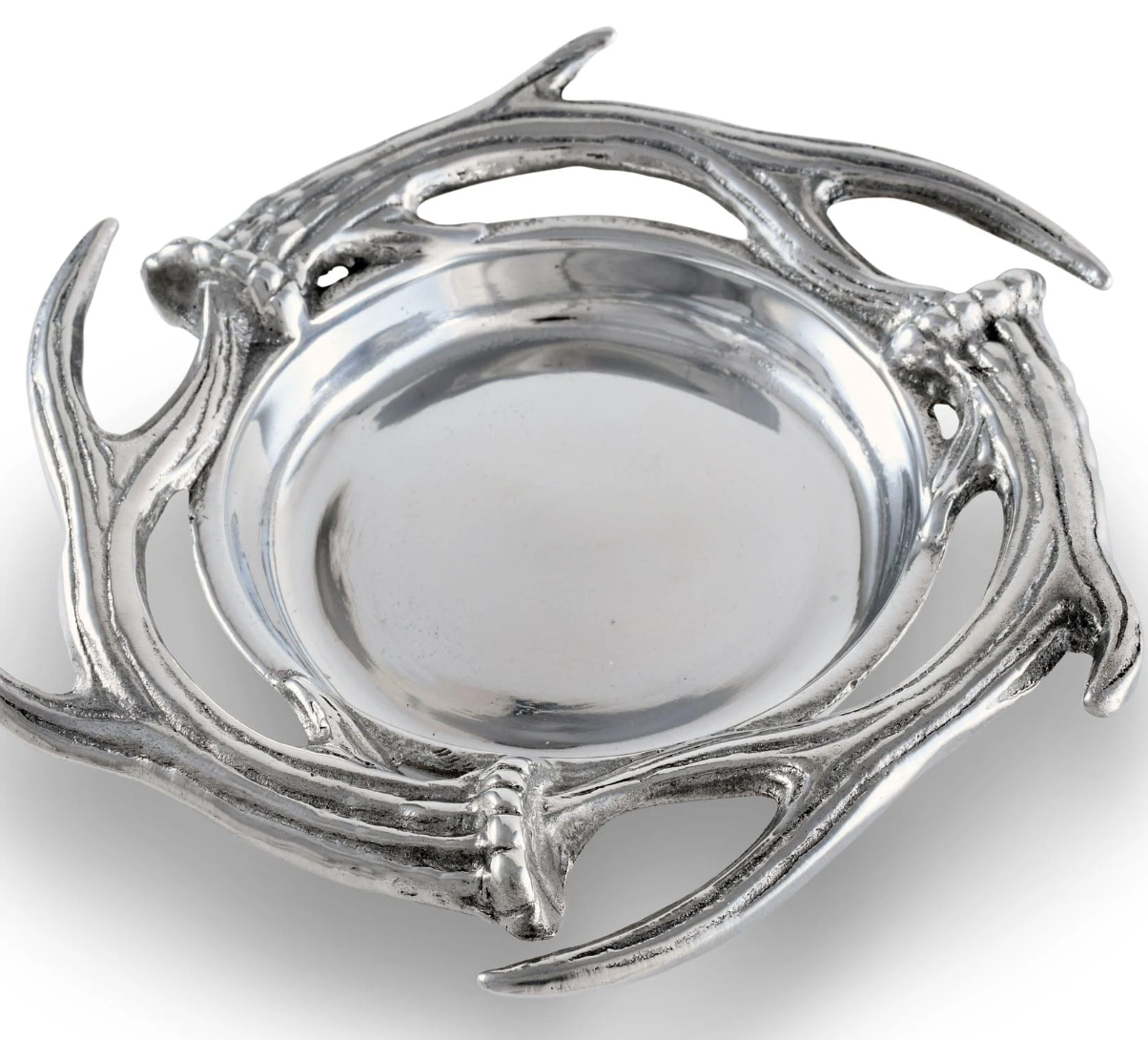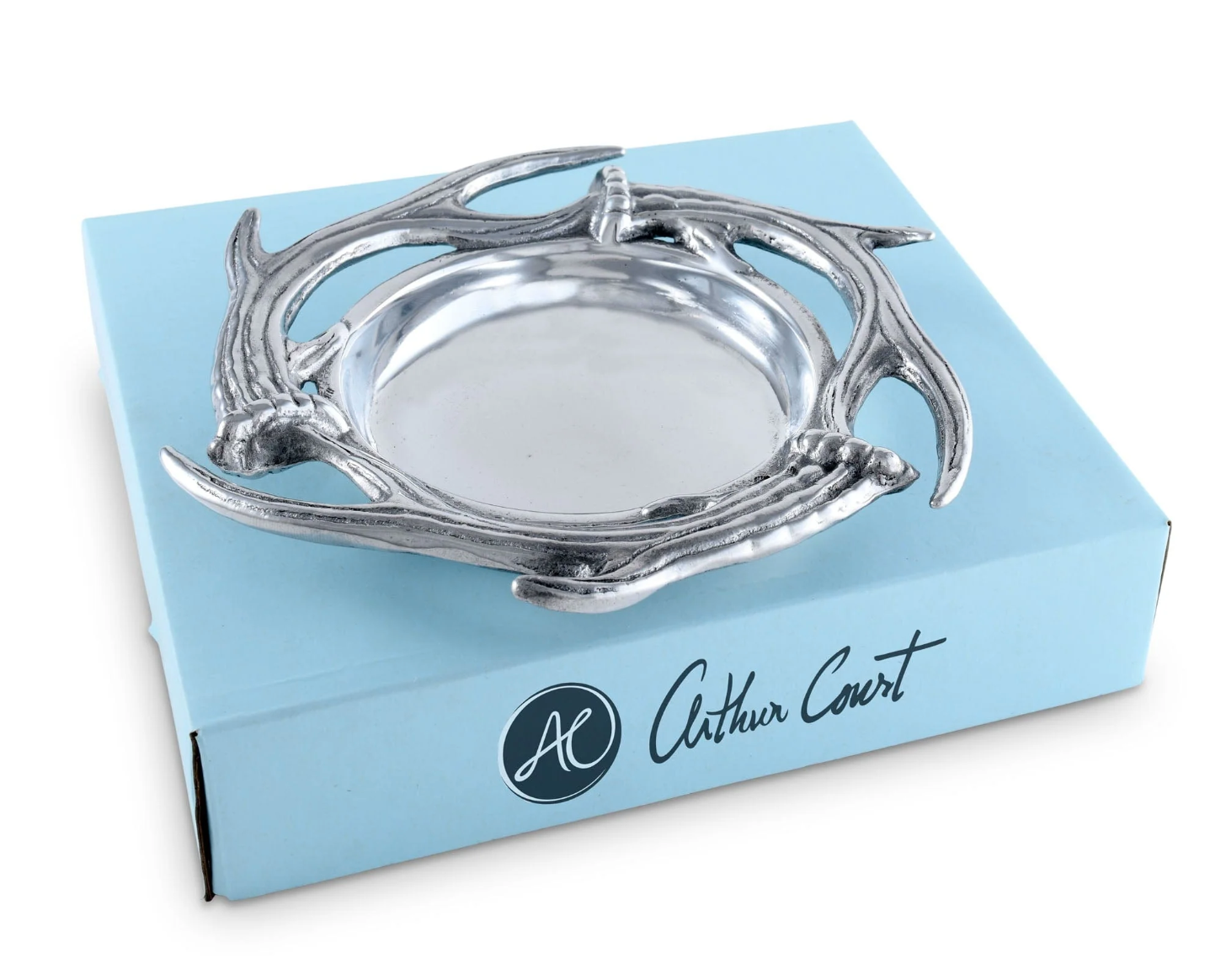 Antlers encircle the coaster as point and burr connect in a flowing, sophisticated symmetry. The exquisite, realistic detail within the antlers contrasts beautifully with the gleaming interior of this handmade, aluminum coaster.