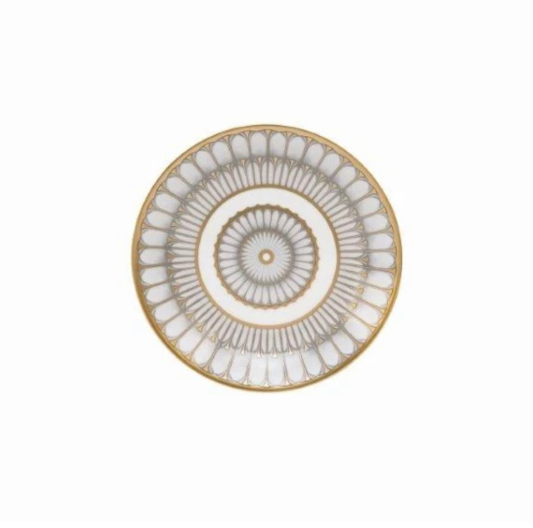 Inspired by Florentine architecture, colonnades of dove-gray glaze and hand-decorated fillets of gold ring this dinner plate with exquisite detail. Pristine white Limoges porcelain complements the refined motif and gives the collection enduring, heirloom quality. Master artisans handcraft the collection at the workshops of Deshoulières, makers of fine dinnerware since 1826.