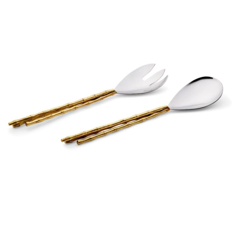 Serve with style at your next gathering with this set of bamboo accent salad servers. Nickel with gold accents.