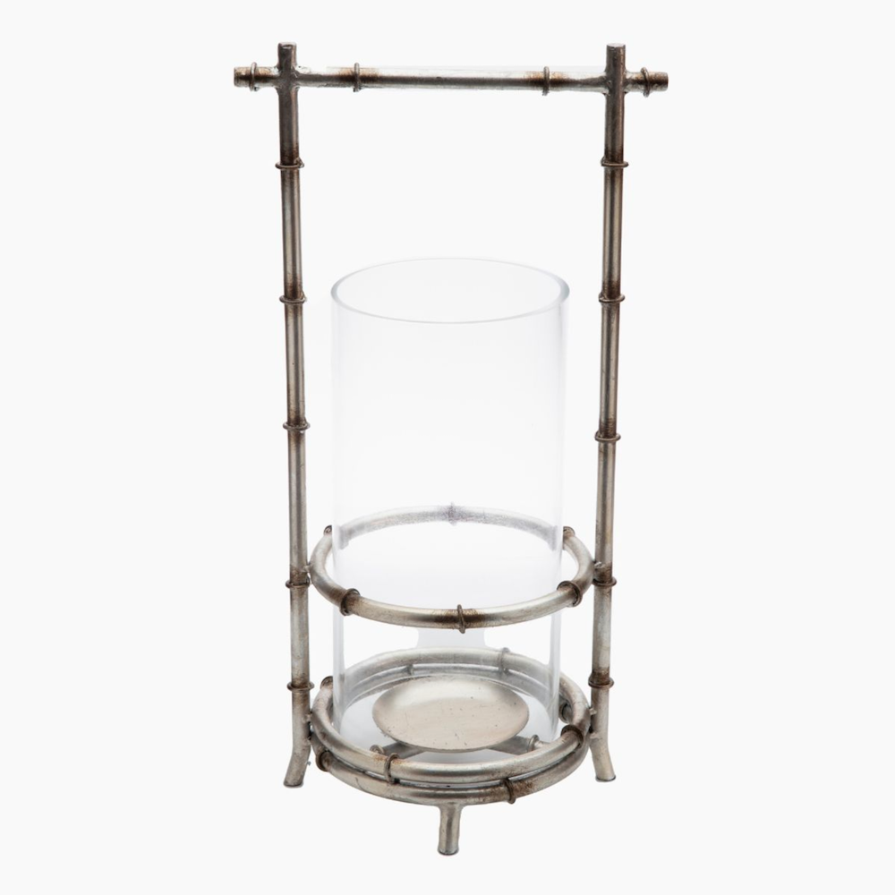 Pair of bamboo hurricane candleholders. Create a warm, inviting atmosphere in your home with this Asian-inspired pair. Finished in an antique silver color, it looks lovely on a mantelpiece, buffet or table. Sized to hold a 3" pillar candle.