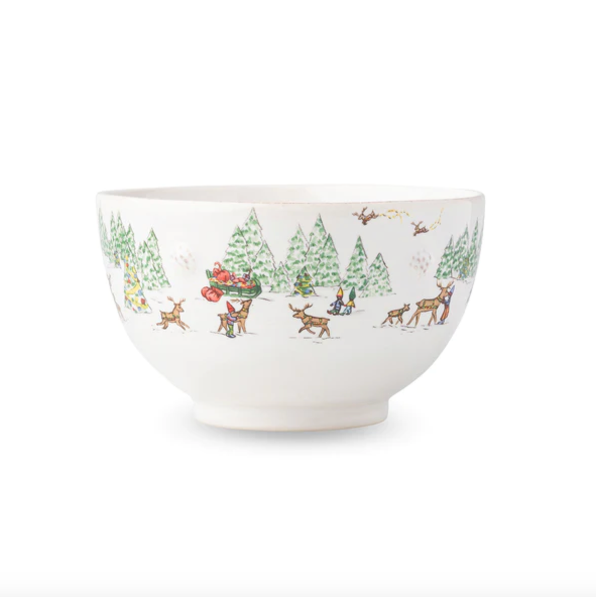 The mythical, folkloric world of the North Pole is hand illustrated atop our iconic Berry & Thread scalloped shape. Enjoy our whimsical depiction of the Elves' village, with colorful cabins dotting the Nordic landscape, complete with Rudolph flying overhead.