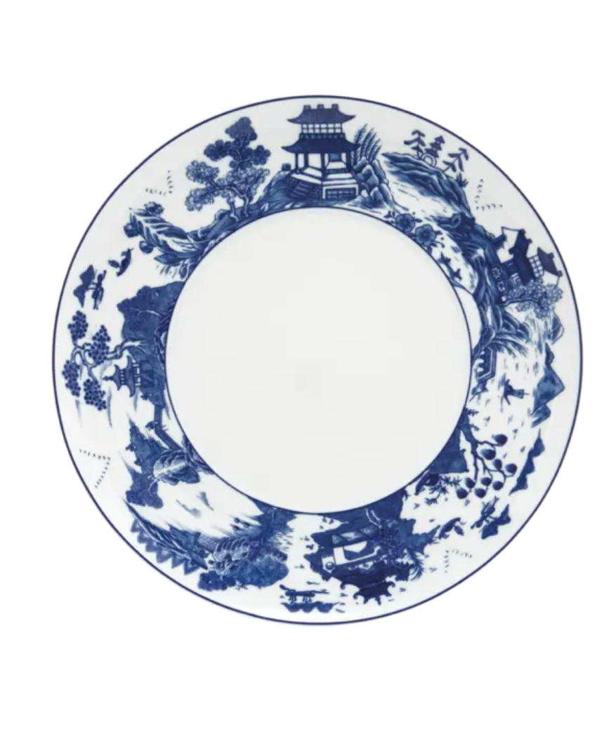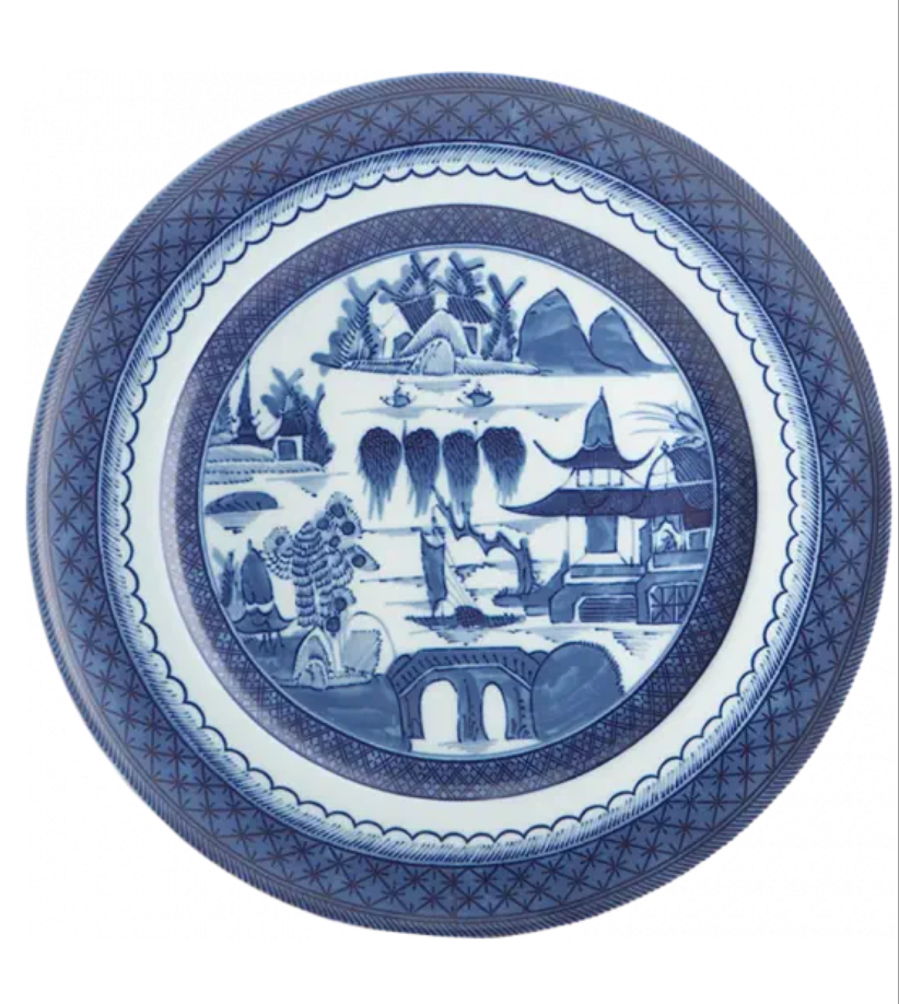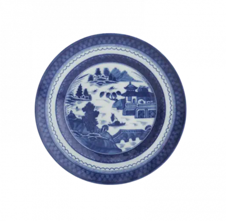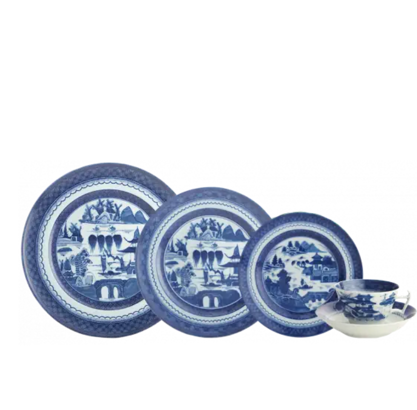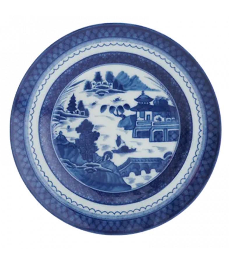 Recognized by the blue lattice border surrounding a variety of landscape scenes, this popular Chinese pattern inspired a number of European versions, most notably English stoneware. The most fashionable tables in the early American Republic were set with blue and white “Canton” or “Nanking” wares, named for the great Chinese trading ports from which they came. Chinese blue and white porcelain was in demand in this country well into the nineteenth century and has become a part of the heritage of many American families. Blue Canton faithfully recaptures this centuries-old tradition and taste.