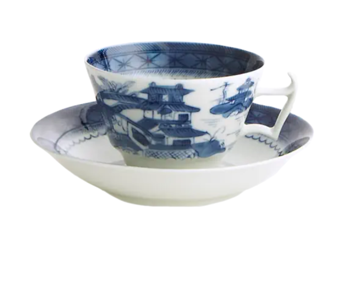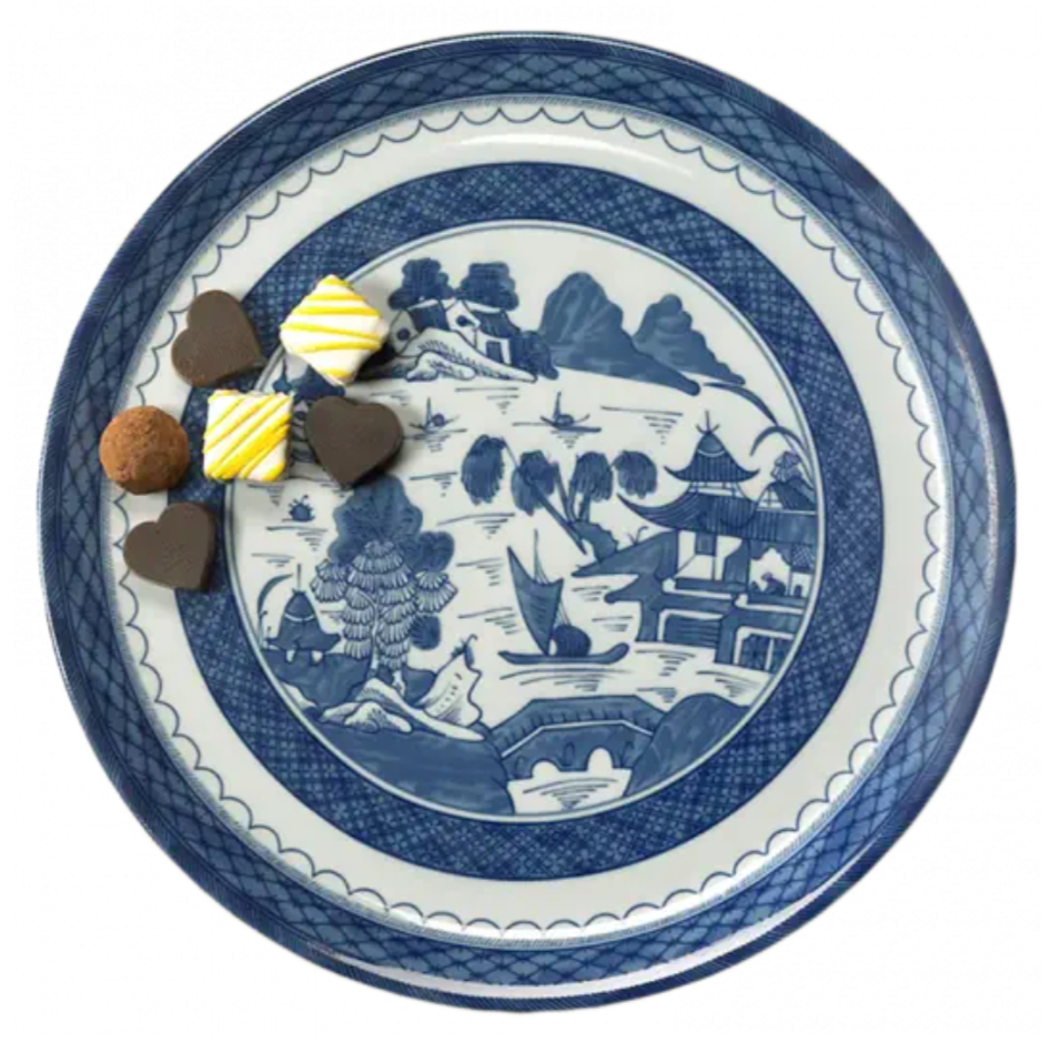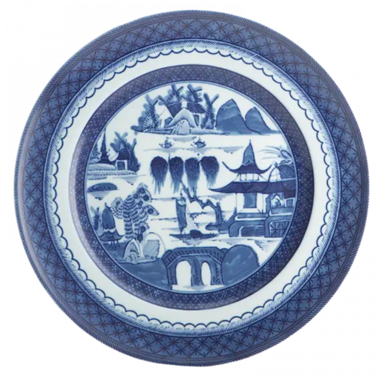 Recognized by the blue lattice border surrounding a variety of landscape scenes, this popular Chinese pattern inspired a number of European versions, most notably English stoneware. The most fashionable tables in the early American Republic were set with blue and white “Canton” or “Nanking” wares, named for the great Chinese trading ports from which they came. Chinese blue and white porcelain was in demand in this country well into the nineteenth century and has become a part of the heritage of many American families. Blue Canton faithfully recaptures this centuries-old tradition and taste.