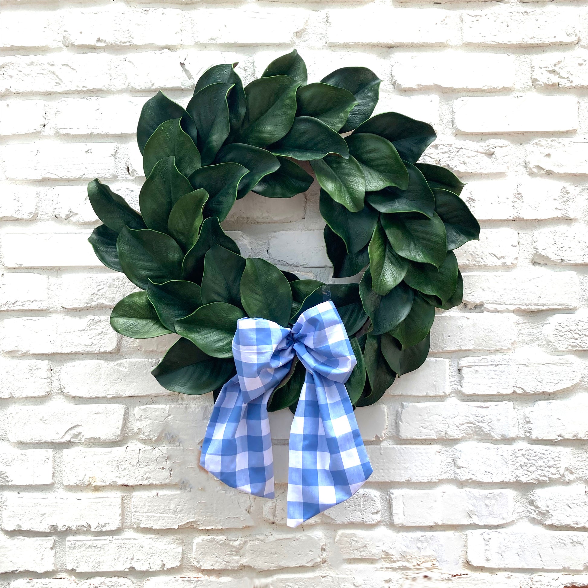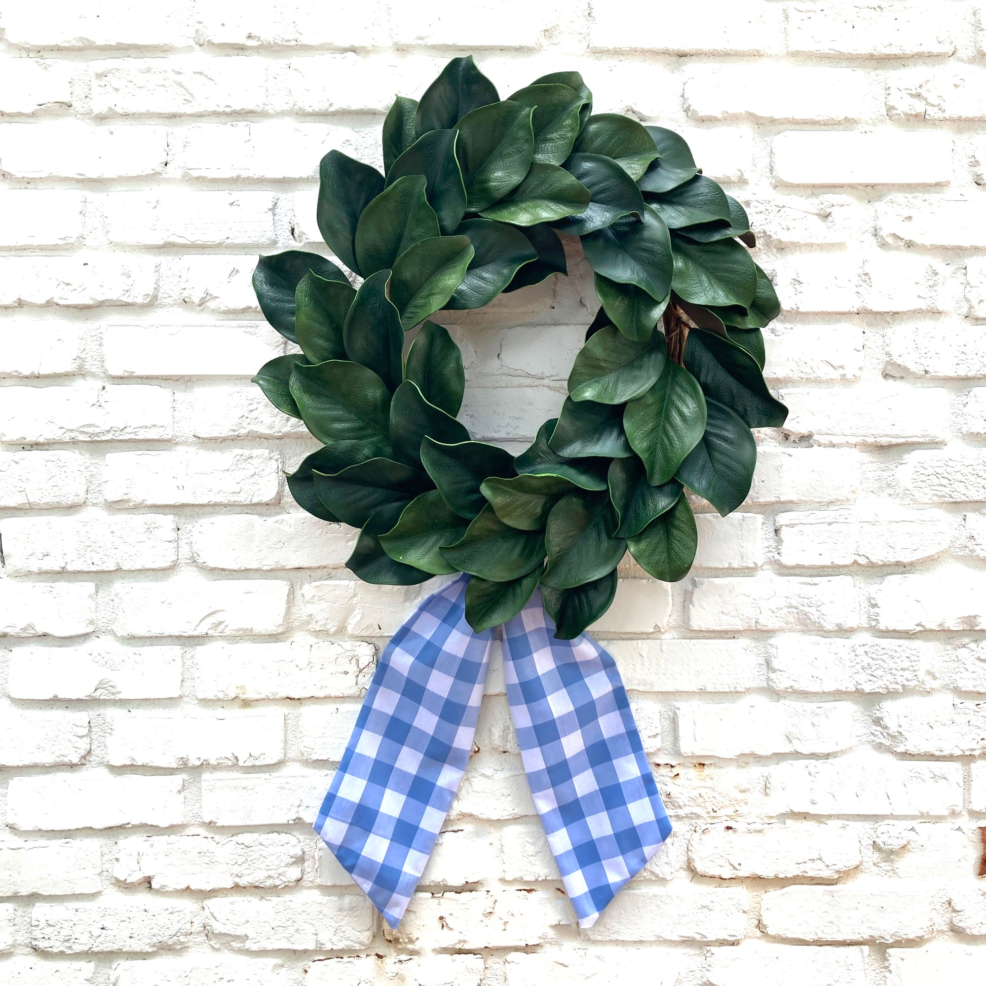 Pretty blue check wreath sash. Drape long, loop, or pinch into a pretty bow. Versatile use: as a door wreath, on a vase or basket, or wrap a special gift! Customize with monogram or motif.