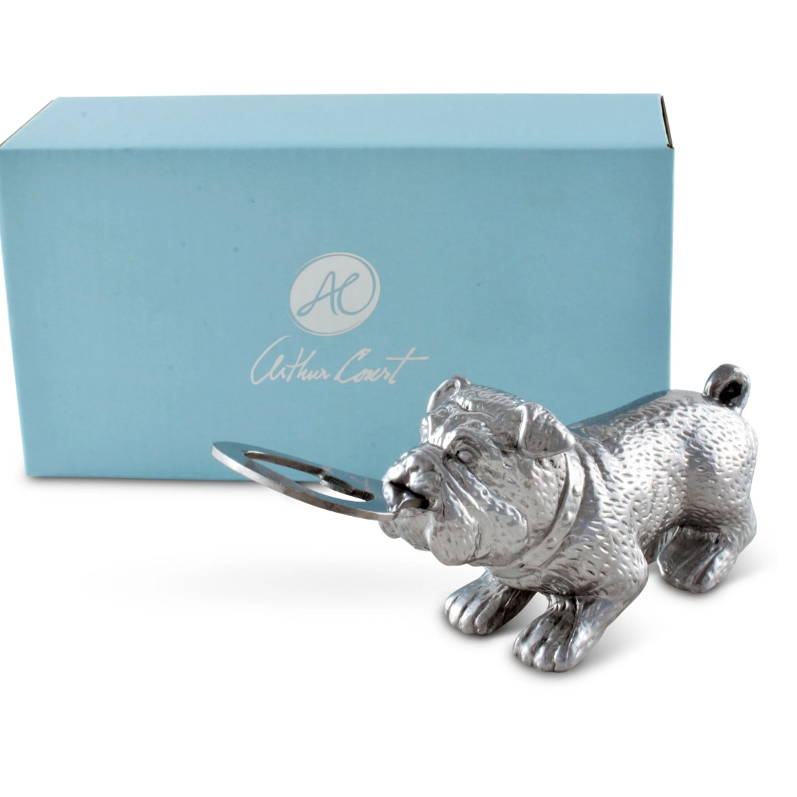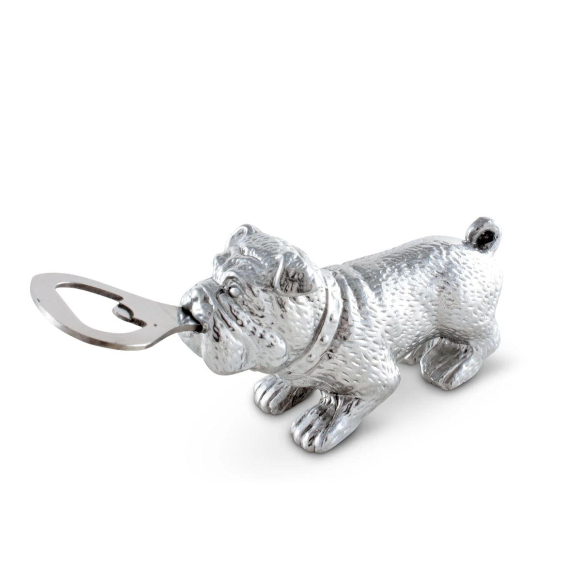 This playful Bulldog Bottle Opener from Arthur Court.is ready to find a forever home Created for dog lovers everywhere our lovable Bulldog is crouched for play while holding the bottle opener like a toy in its mouth. Arthur Court's Bulldog Bottle Opener is handcrafted pop art with a stainless opener and durable, sand-cast aluminum figural handle. This pup's authentically wrinkled fur coat, perky ears and cute stubby tail are signature Arthur Court details that will make you proud to "adopt" this hard working little Bully into your home.
