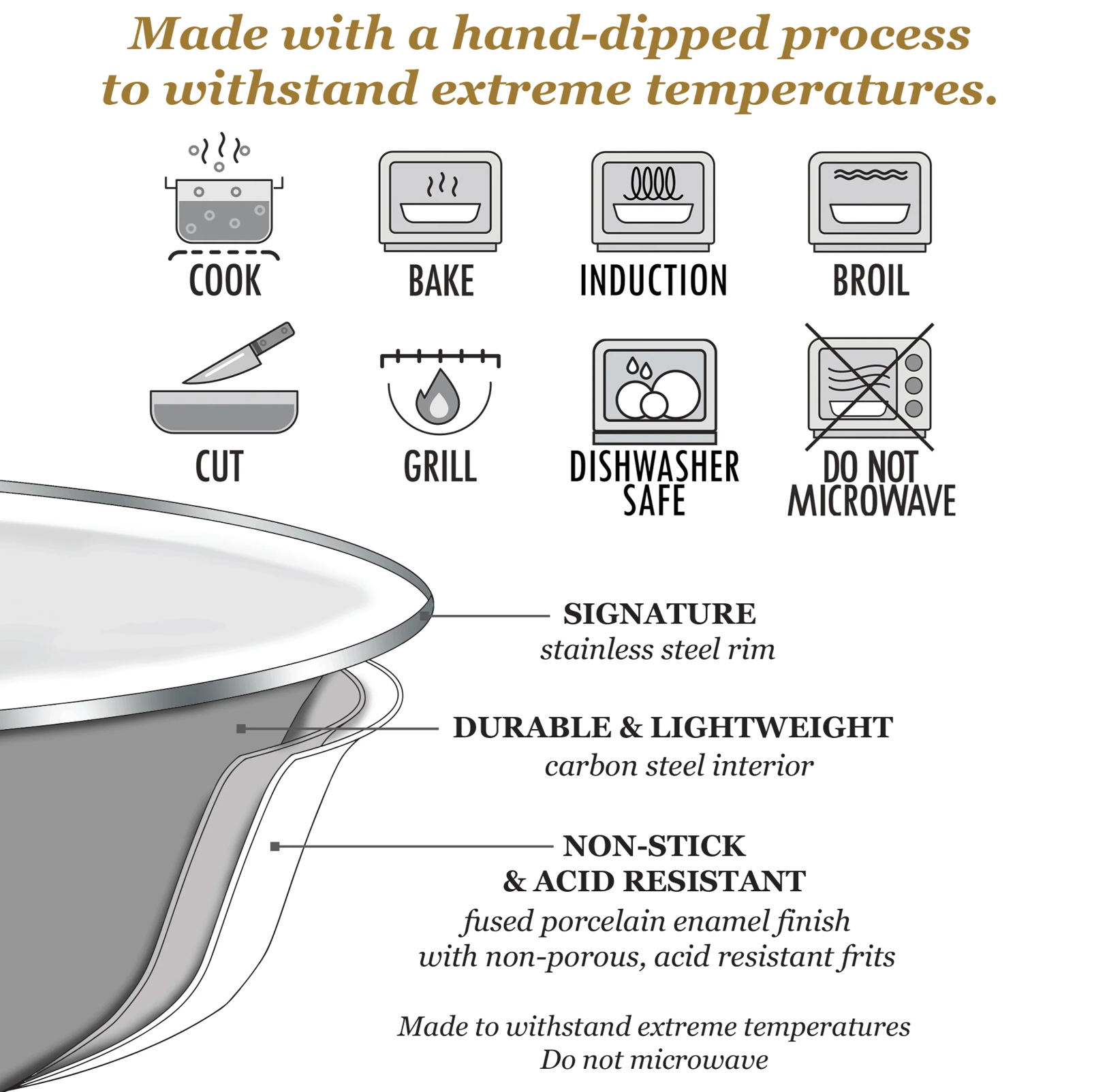 This enamelware is made of carbon steel coated with a porcelain enamel and trimmed in stainless steel. There will be variations in the shading of colors and pattern formations which are the results of the hand-dipped process.