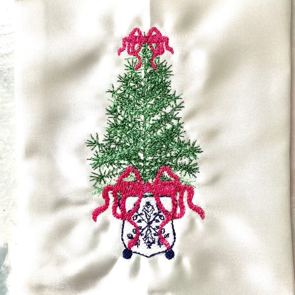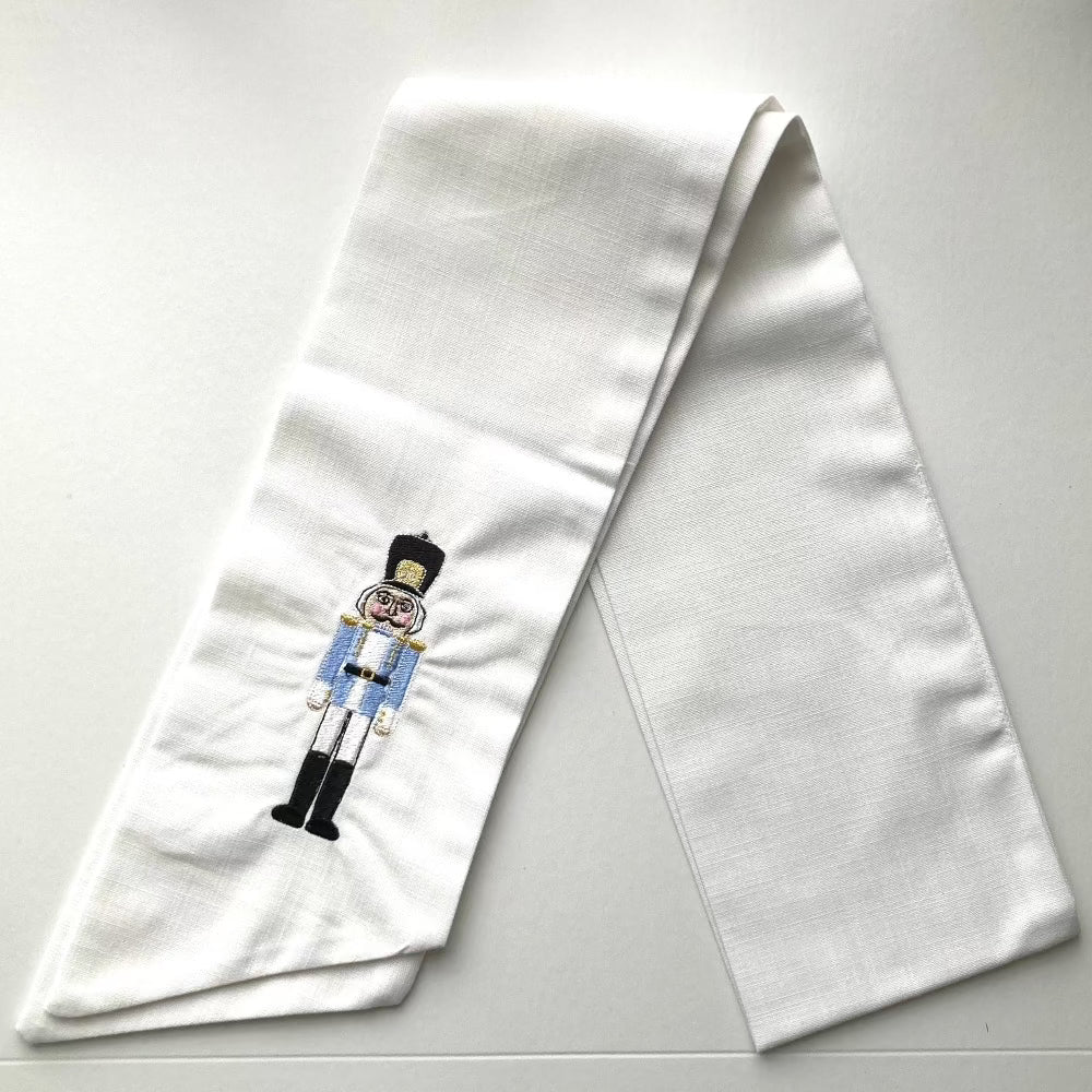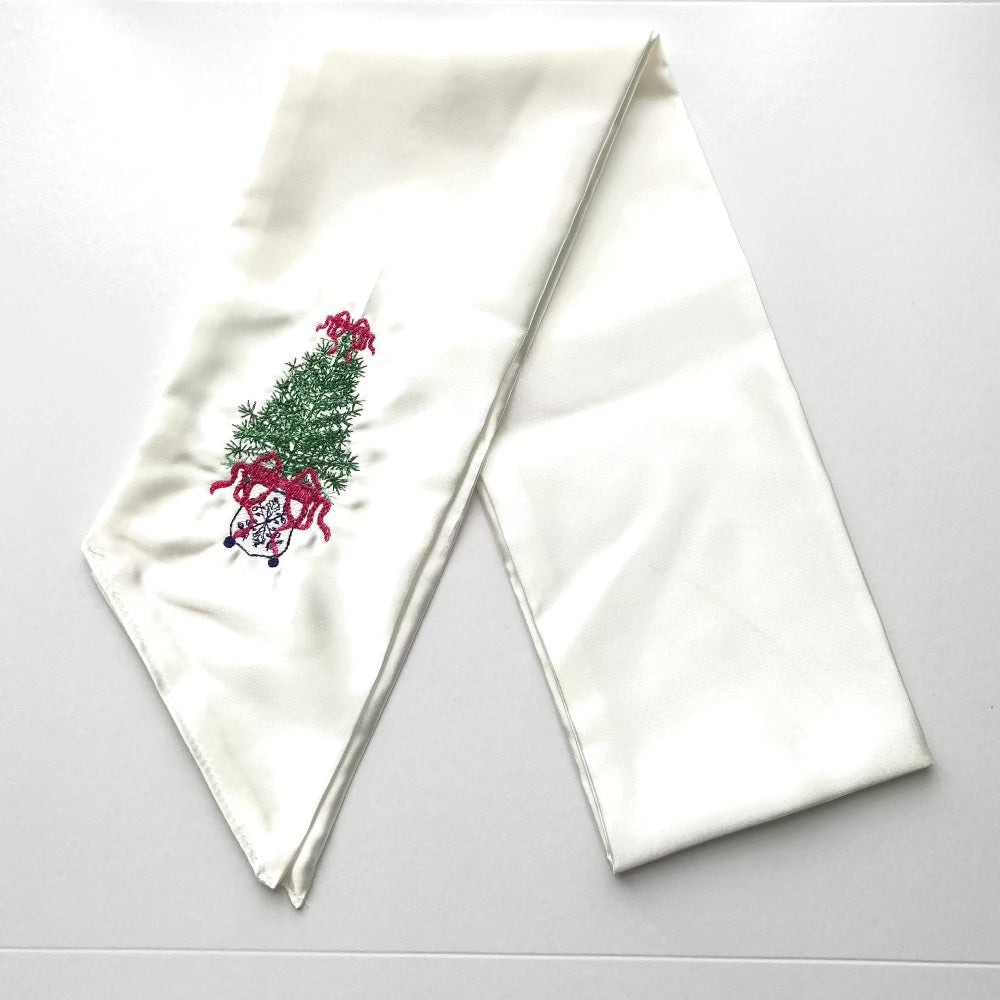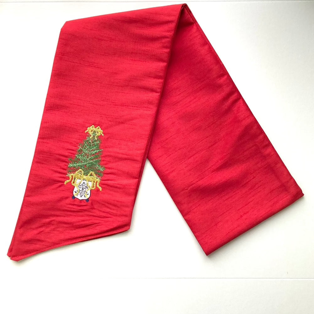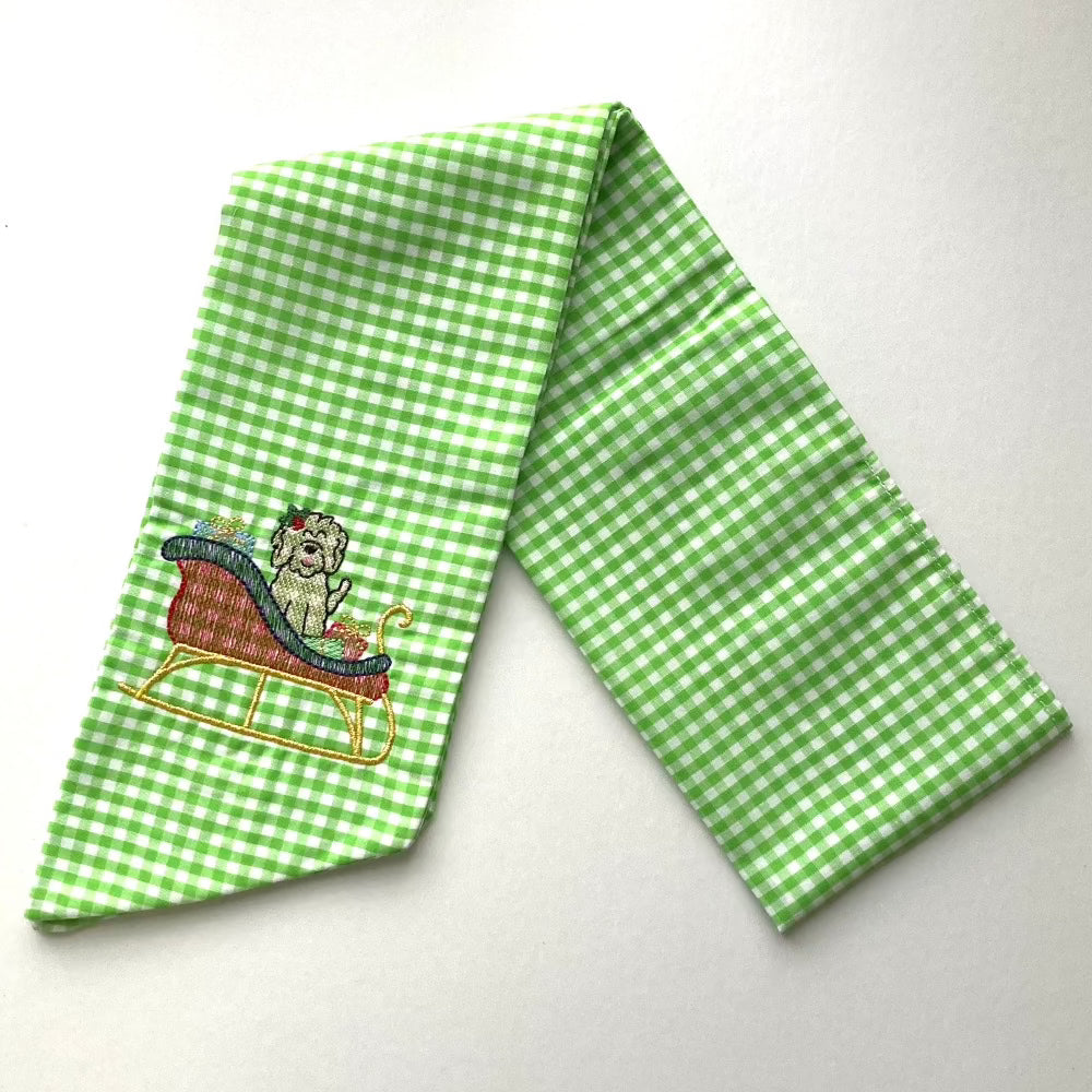 Christmas wreath sash, assorted colors and embroidered designs. Drape long, loop, or pinch into a pretty bow. Versatile use as a door wreath, on a vase or basket, or wrap a special gift. Choose from a pretty Christmas tree, fun doodle sleigh dog, crab w/lights, nutcracker and more! Add on personalization during checkout.