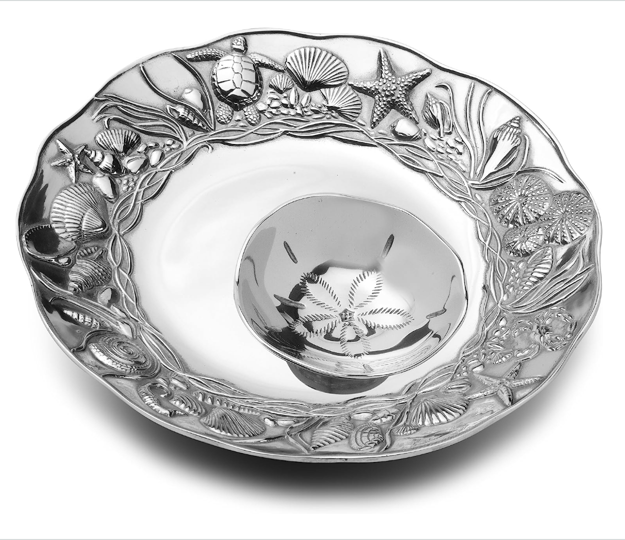 This Coastal 2-piece Chip and Dip features an undersea theme of starfish, turtles, and shells with a removable dip bowl that features the look of a sand dollar. Chip and Dip measures 16 inches long by 15 1/2-inches wide