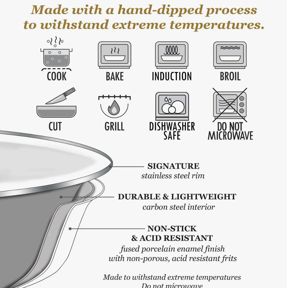 6 qt Stock Pot 6 qt capacity with tempered glass lid 9.25 inch diameter x 5 inch deep • Kiln Fired Porcelain Enamel Finish on Steel • Stainless Steel Rim for Extra Durability • Dishwasher Safe - Oven and Stovetop Safe - Works with Induction - Not Intended for Microwave Classic and colorful, spatterware is at home in a country kitchen or striking in a high setting. From oven to table to the dishwasher, Golden Rabbit enamelware is fully functional without forgetting the fun. Whether mixed or matched, our array of shapes and sizes can impressively outfit any event or enhance your existing table theme.