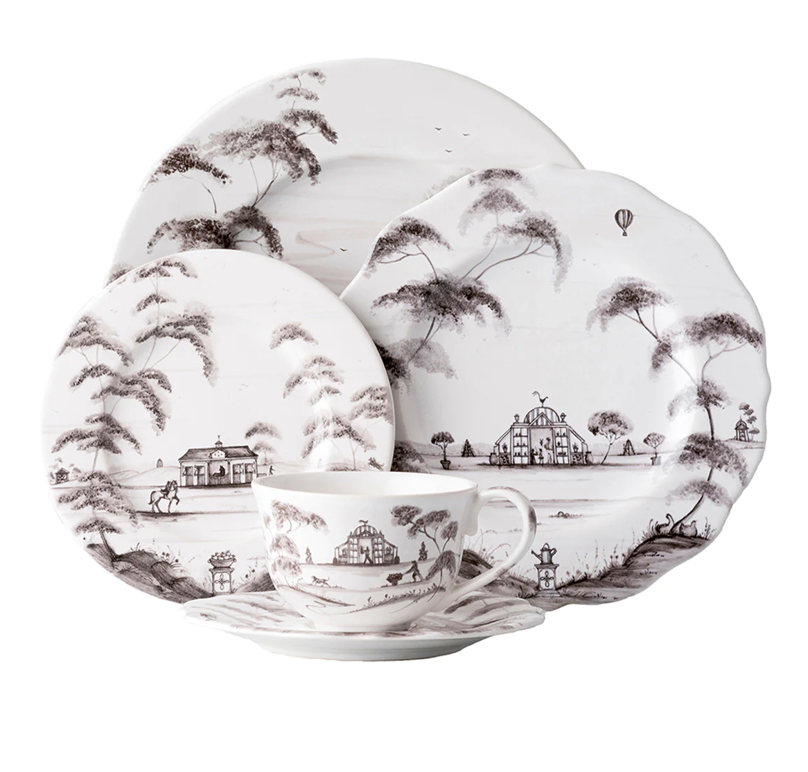 From our Country Estate Collection- Featuring narratives of the English Countryside, our 5 piece setting in contains a dinner plate, dessert/salad plate, side/cocktail plate, tea/coffee cup and saucer.