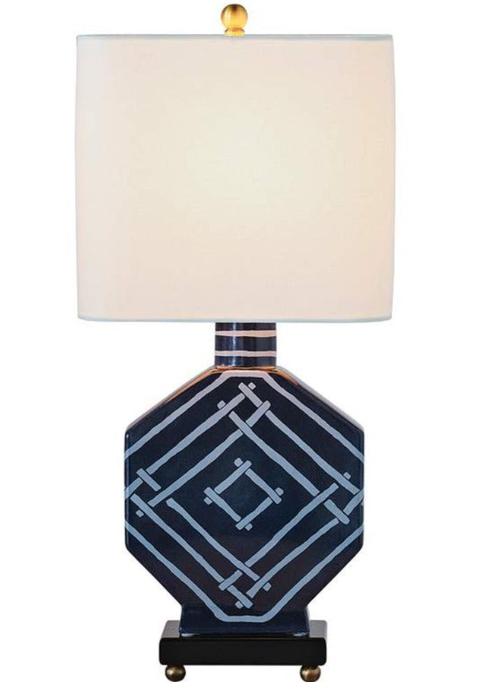 Perfectly placed by a sofa or bed, this wood and porcelain table lamp illuminates a room in style. Its artful design features a gorgeous indigo finish in a classic trellis pattern on a striking, octagon-shaped silhouette. Its rectangular hardback shade is made from linen and cotton to cast a beautiful, diffused glow. A wood base with aged brass metal feet and finial round out the appeal of this charming creation by Madcap Cottage for Port 68.