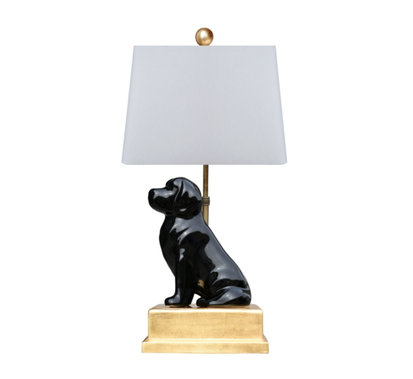 Porcelain Black Labrador Retriever Lamp with gold leaf base and gold leaf finial
