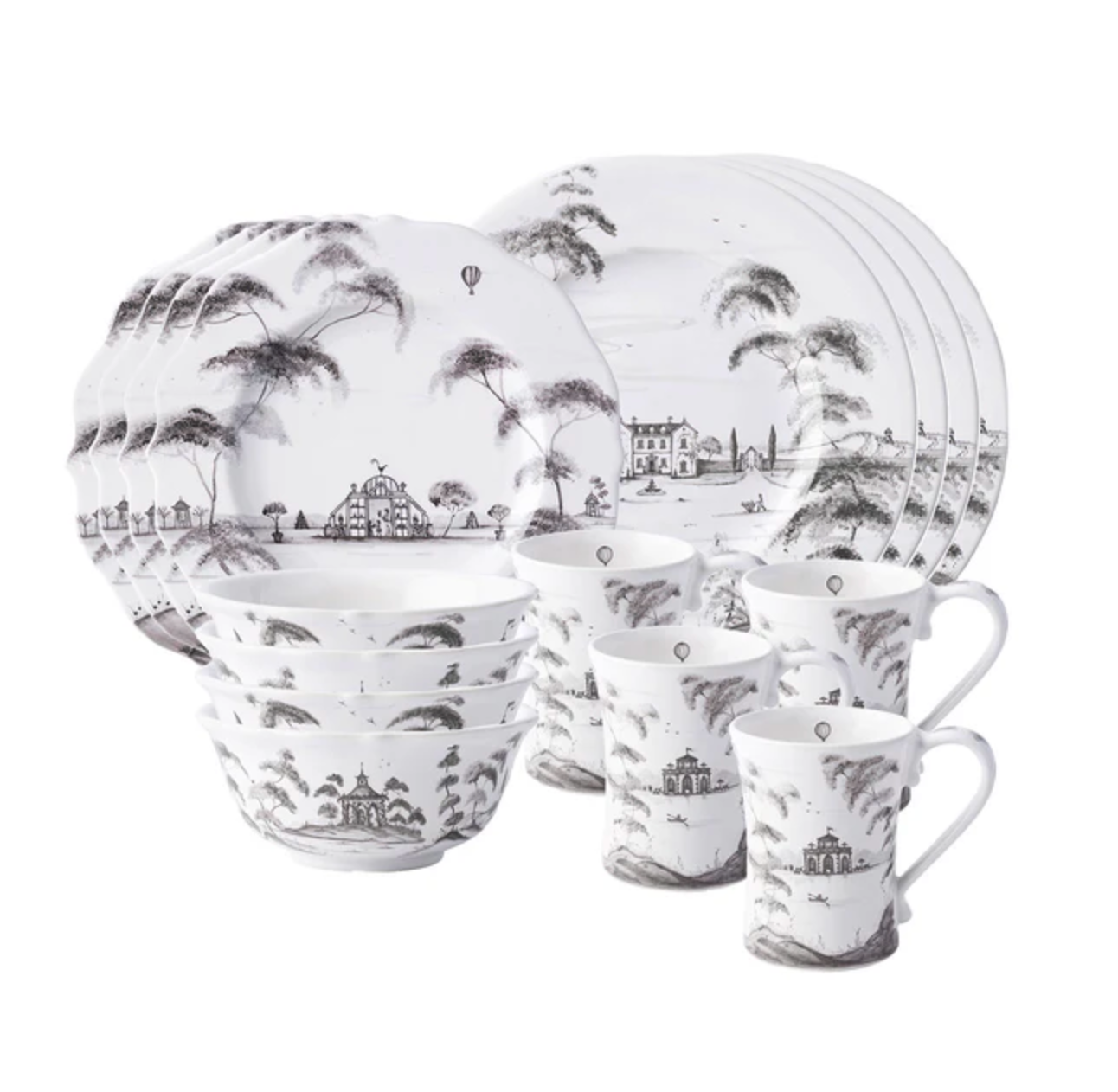 From our Country Estate Collection- Featuring narratives of the English Countryside, our 16 piece setting in Flint Grey contains 4 dinner plates, 4 dessert/salad plates, 4 cereal/ice cream bowls, and 4 coffee cups.