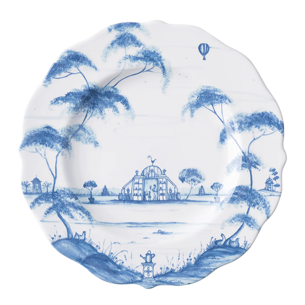 From our Country Estate Collection- The Conservatory is a serene place of growth and nurturing, reminding us to spend time with loved ones over al fresco summertime lunches. Our scalloped plate pairs superbly with long conversations and perfumed salads plucked from the herb garden. Or for a solitary respite, spend an afternoon penning sonnets in the Reading Pavilion with a slice of spiced chocolate cake. Featuring: Conservatory, Reading Pavilion, Hen House, and Balloon.