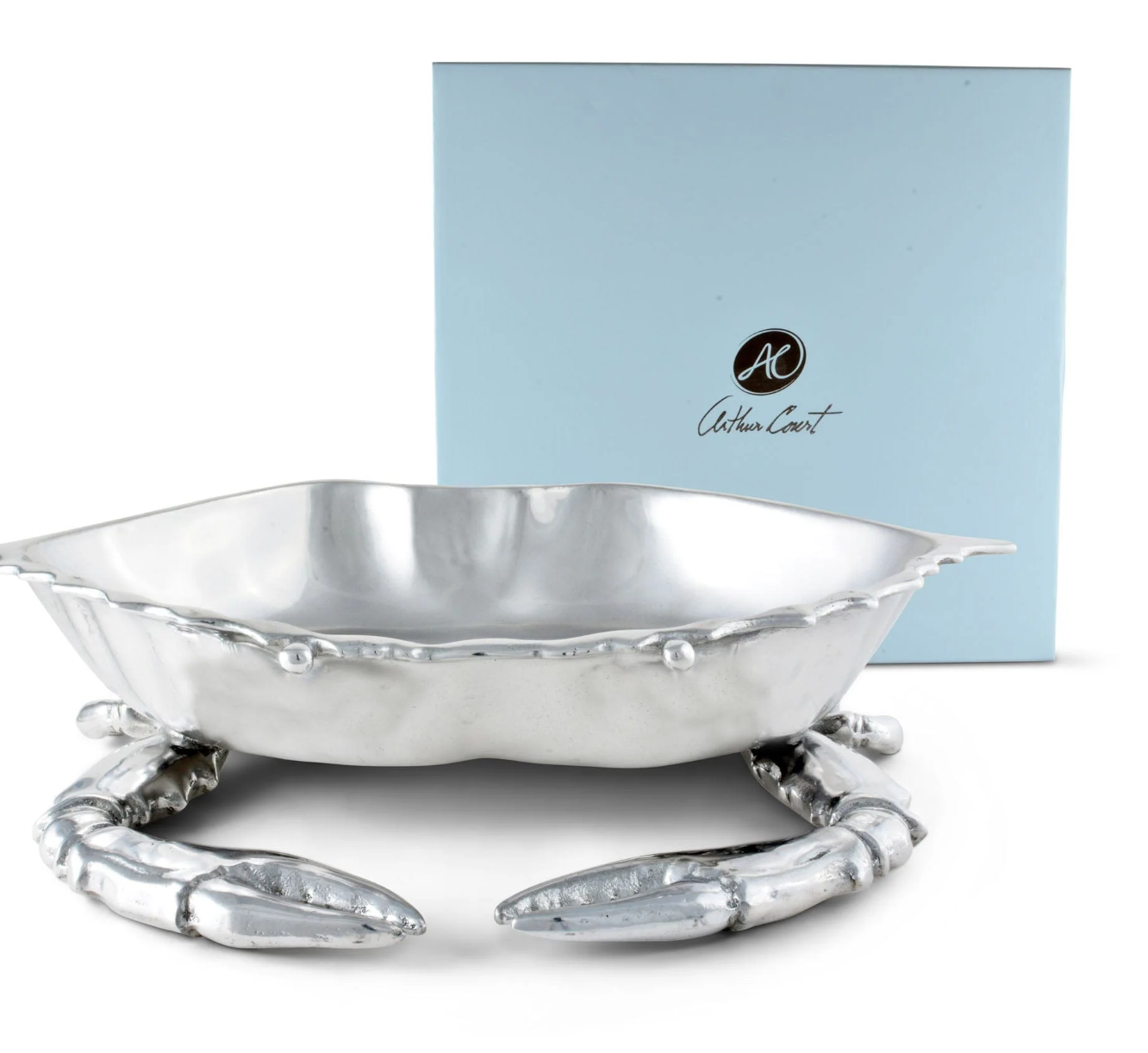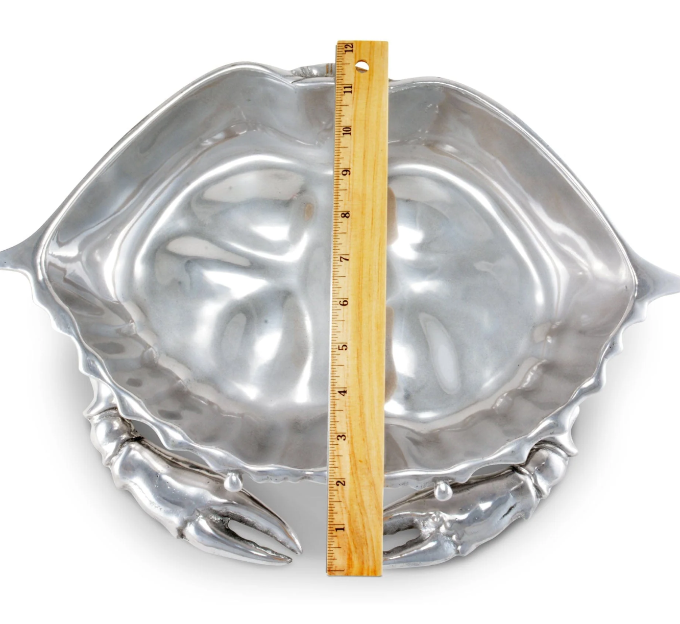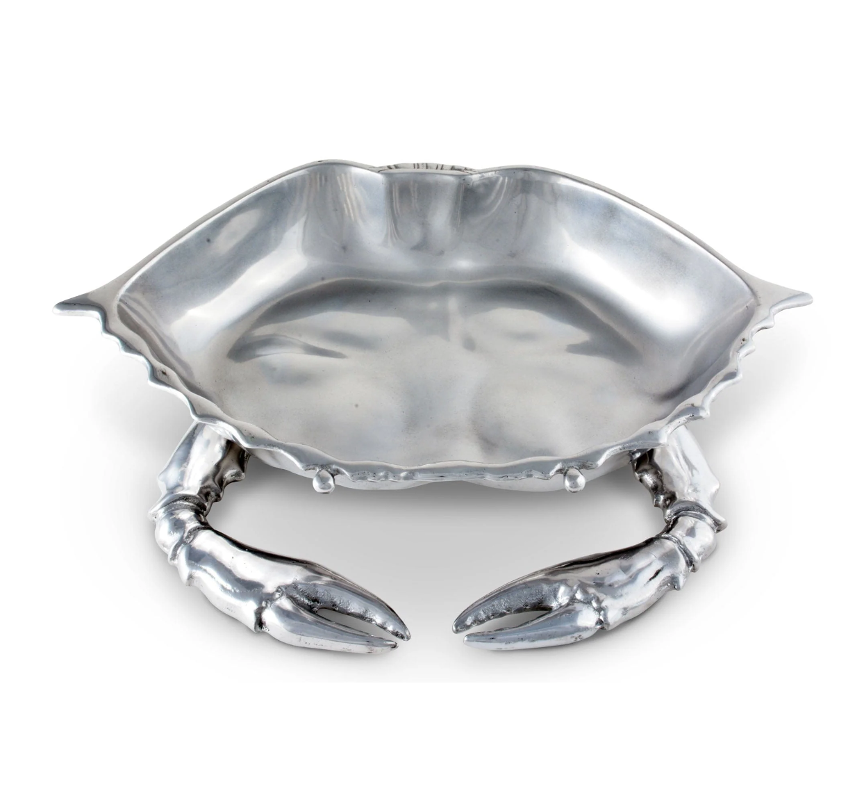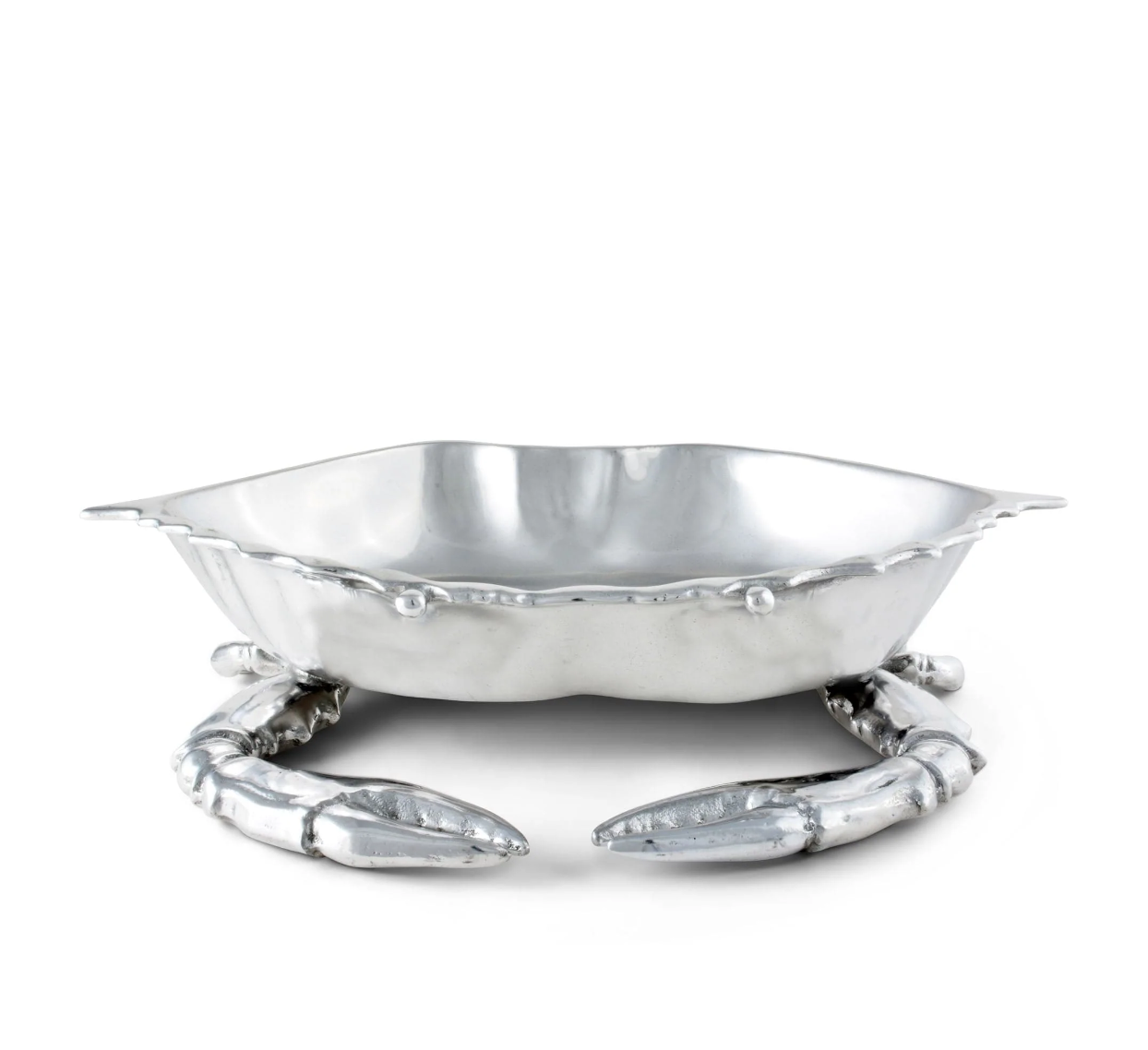Beady eyes stare out from the crab's hollowed shell, while jagged edges still give the hexagonal bowl a realistic feel. The crustacean's claws feature realistic, ribbed features, which add to the beautiful craftsmanship of this handmade, aluminum piece.