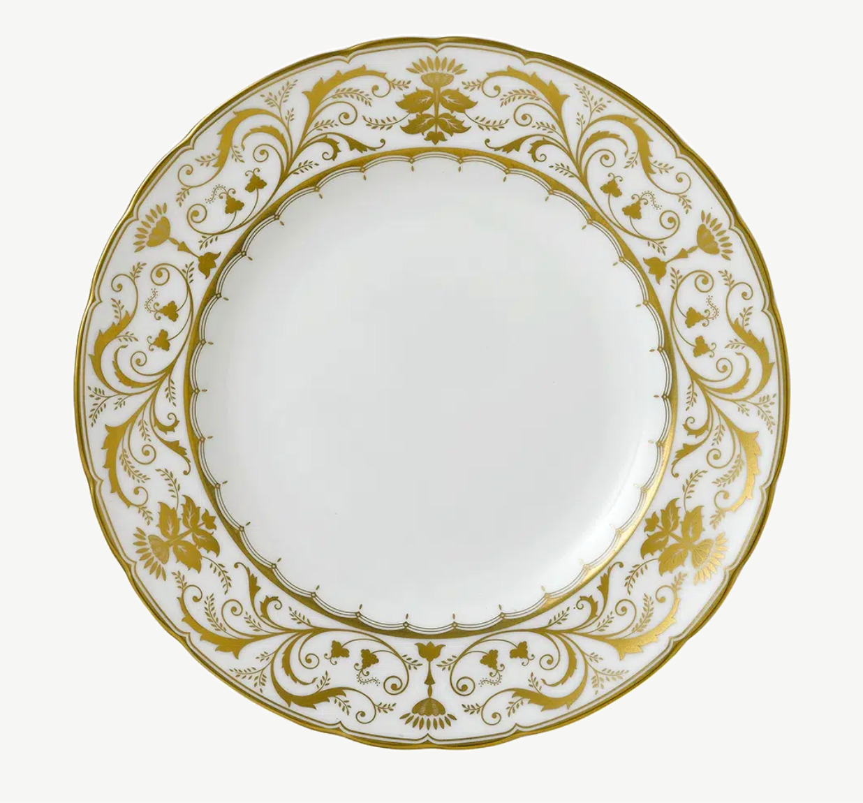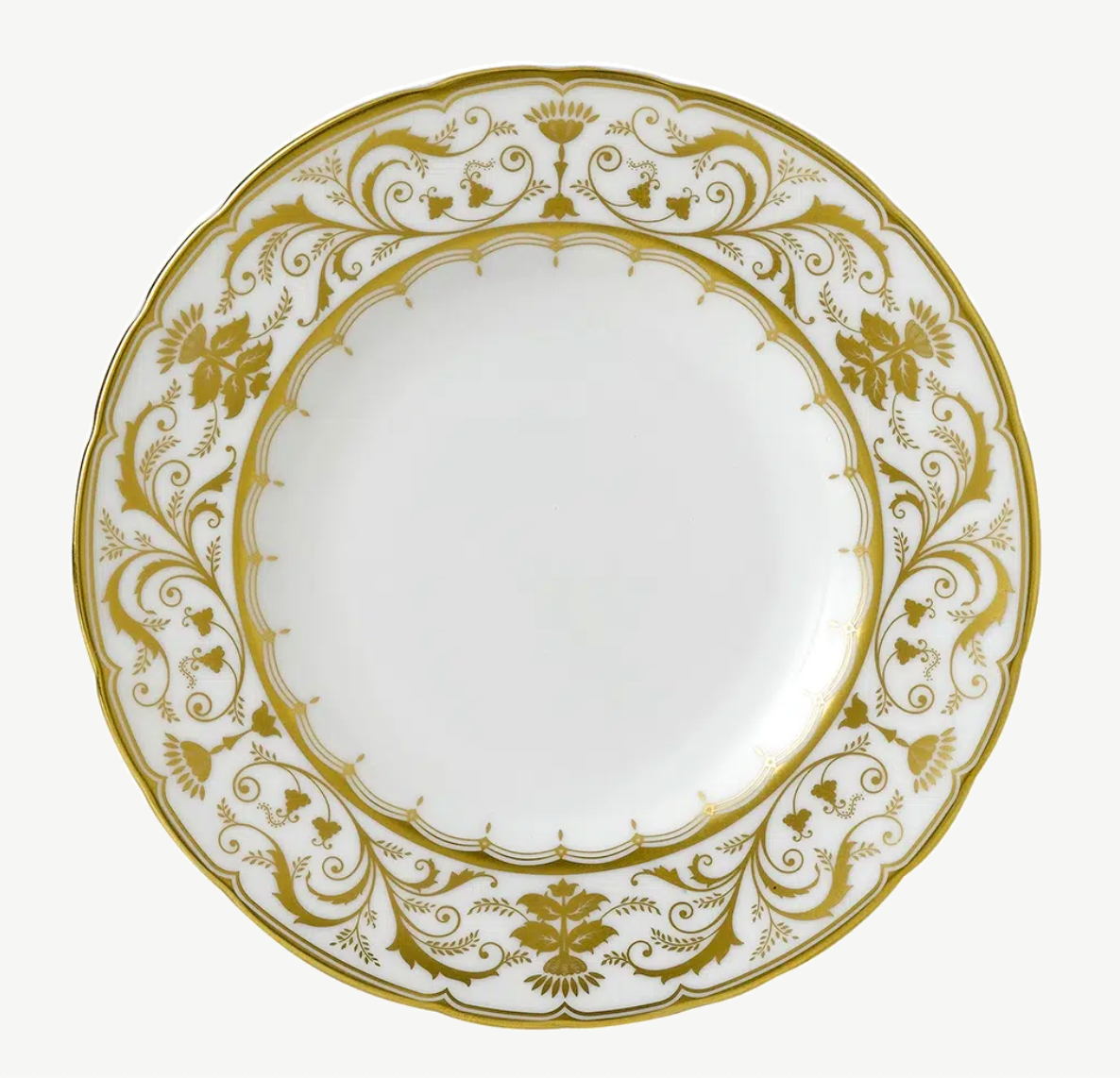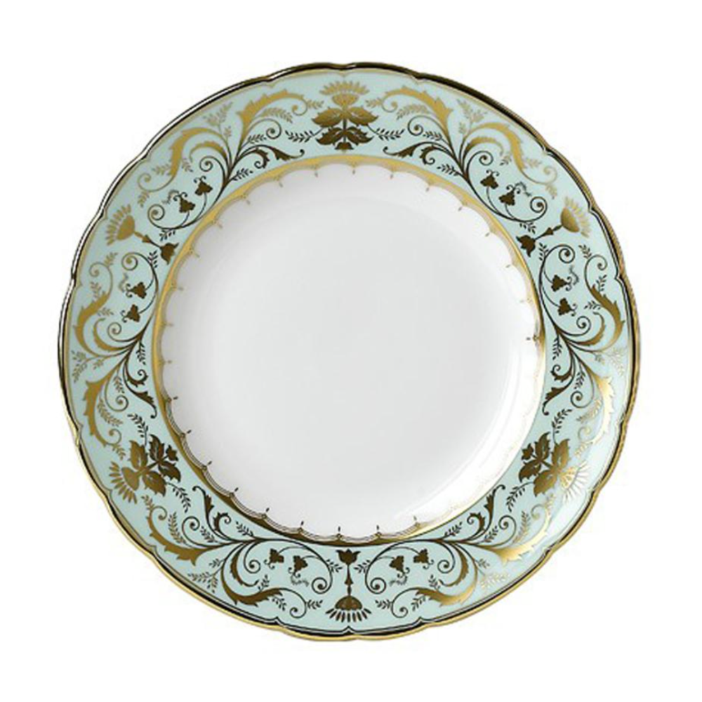 Darley Abbey captures the style of restrained simplicity using delicate lines and intricate curves representing twirling foliage and filigree leaves combined with 22 karat gold on a soft green silk damask background over white bone china. Handmade in England.