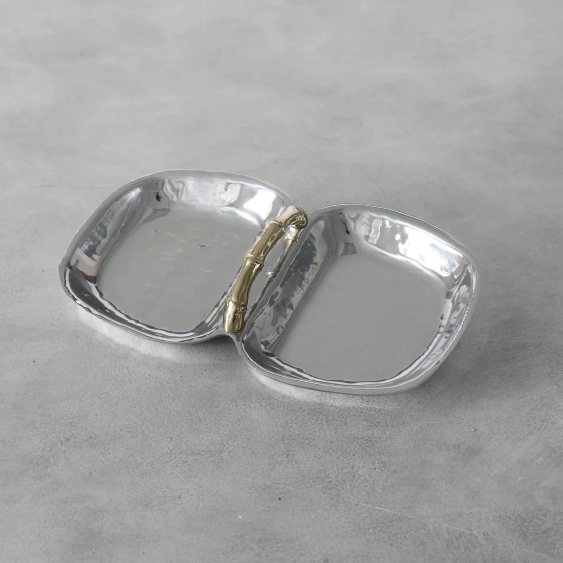 Glamour from the Garden! Beatriz Ball heralds the return of a design classic and a hallmark of the Grandmillenial style ... Bamboo. Get a second helping of Bamboo style with this artfully divided design. The Beatriz Ball GARDEN Bamboo Double Dip with Gold Handle two-section piece combines our signature hand-polished metal and a curved bamboo-inspired handle in a proprietary gold-tone. It has twice the serving potential, with style to spare. Naturalistically detailed, the versatile divided platter makes a welcome addition to the table, kitchen island or bar. Looks great with other Beatriz Ball Bamboo designs and makes a luxurious gift. Beatriz Ball’s intensely handmade products employ eco-friendly and sustainable materials and are crafted by artisans who trace a heritage of metalworking for generations. An original Beatriz Ball design, sustainably handmade of a top quality, FDA safe, easy-care, oven and freezer friendly aluminum alloy.