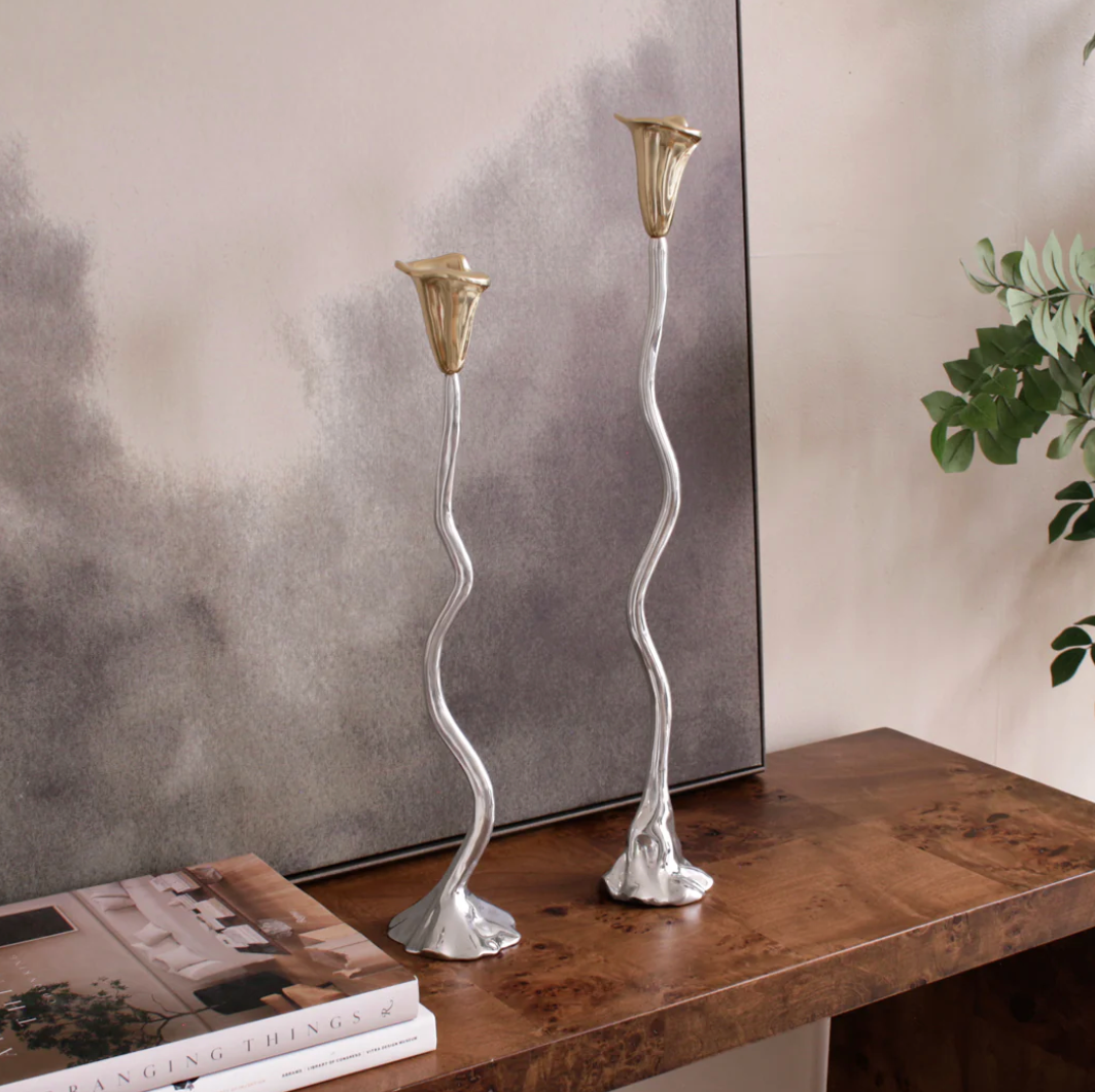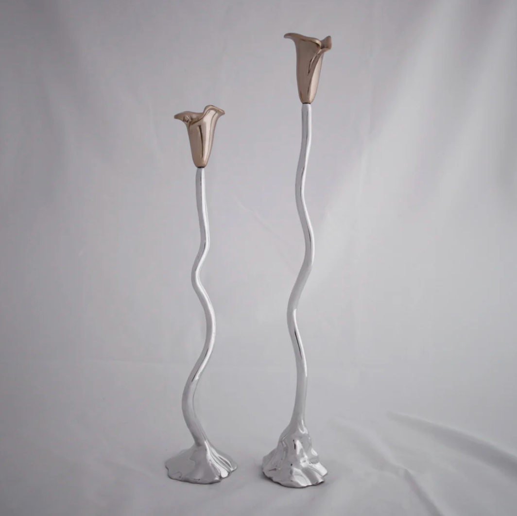 Garden inspired glamour! Beatriz Ball celebrates Garden Style with the luxurious GARDEN Tulip Candlestick Holder 19" with Gold Tulip. A masterpiece of metal sculpture, the shorter Tulip candlestick holder in our signature hand-polished metalware with gold-tone accents is distinguished by its naturalistic details, expert craftsmanship and stately proportions. Guaranteed to add a luxe look to any space, the candlestick holders can be topped with tapers in fun colors or displayed alone as sculptures. A great new addition to your home, pair with the taller version for an impactful presentation! Beatriz Ball’s intensely handmade products use eco-friendly and sustainable materials and are crafted by artisans who trace a heritage of metalworking for generations. Made of a top quality, easy-care aluminum alloy. Tarnish free!