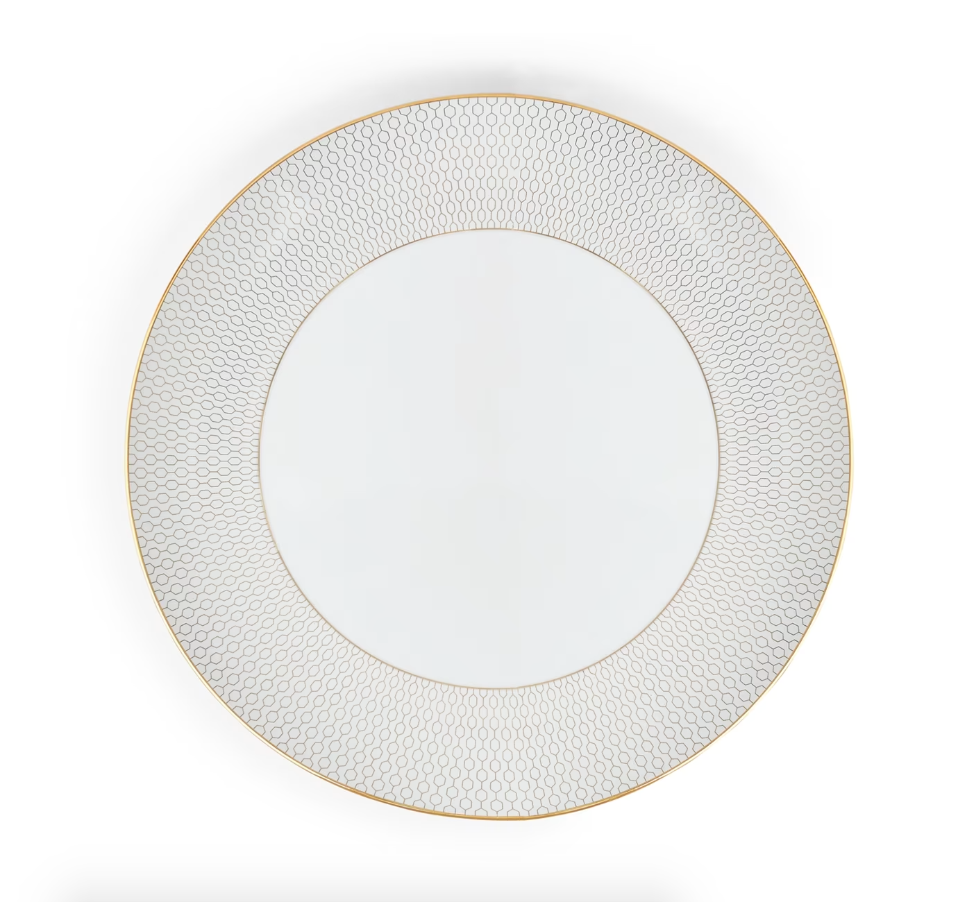 An elegant place setting adds a touch of magic to every meal. Treat yourself to a daily dose of luxury with this sophisticated dinner plate from the Gio Gold collection, where modern style meets Wedgwood tradition. Its intricate geometric pattern on a pure white background combines with a gold band around the rim to create a subtle yet eye-catching effect.