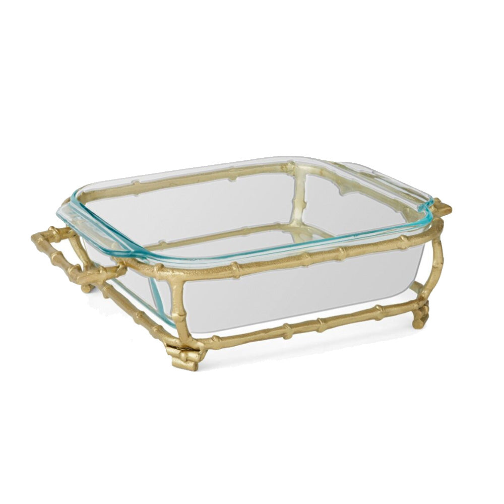 Show off your culinary creations with an elegant flair when you place them before your guests in this beautiful Asian-inspired gold color Bamboo-Look Square Pyrex Holder. This piece makes an exquisite presentation on your dining table, buffet or countertop. Includes glass baking dish. Pyrex dish made in the U.S.; holder made in India. Glass dish only is dishwasher safe; metal holder can be wiped clean with damp cloth. Pyrex dish is oven safe to 450 F.