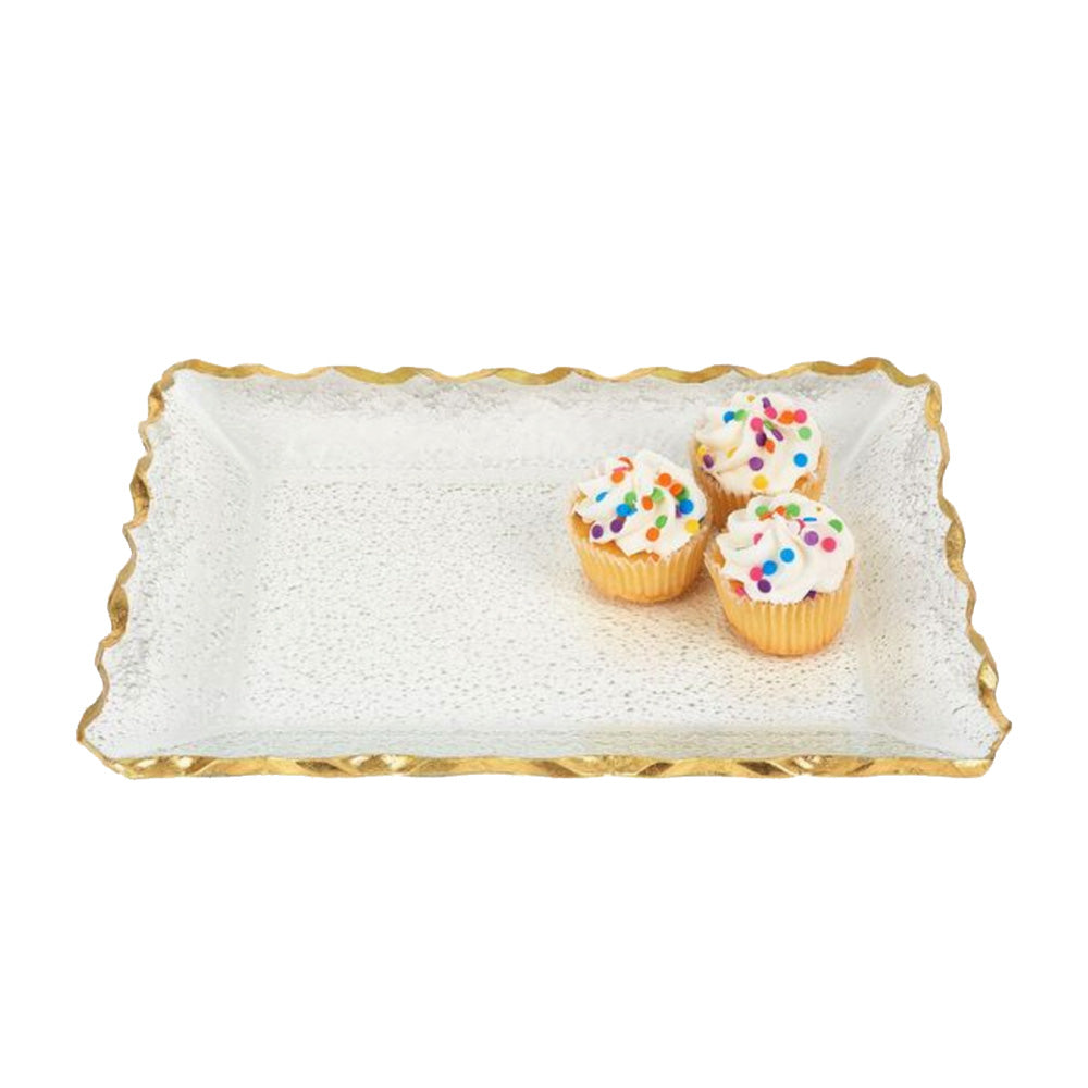 This Handcrafted Gold Edge Decor Long Rectangular Serving Piece is great for serving main or side dishes, breads or desserts and looks great! It holds alot but does not take up alot of space. It is food safe but should be hand washed.
