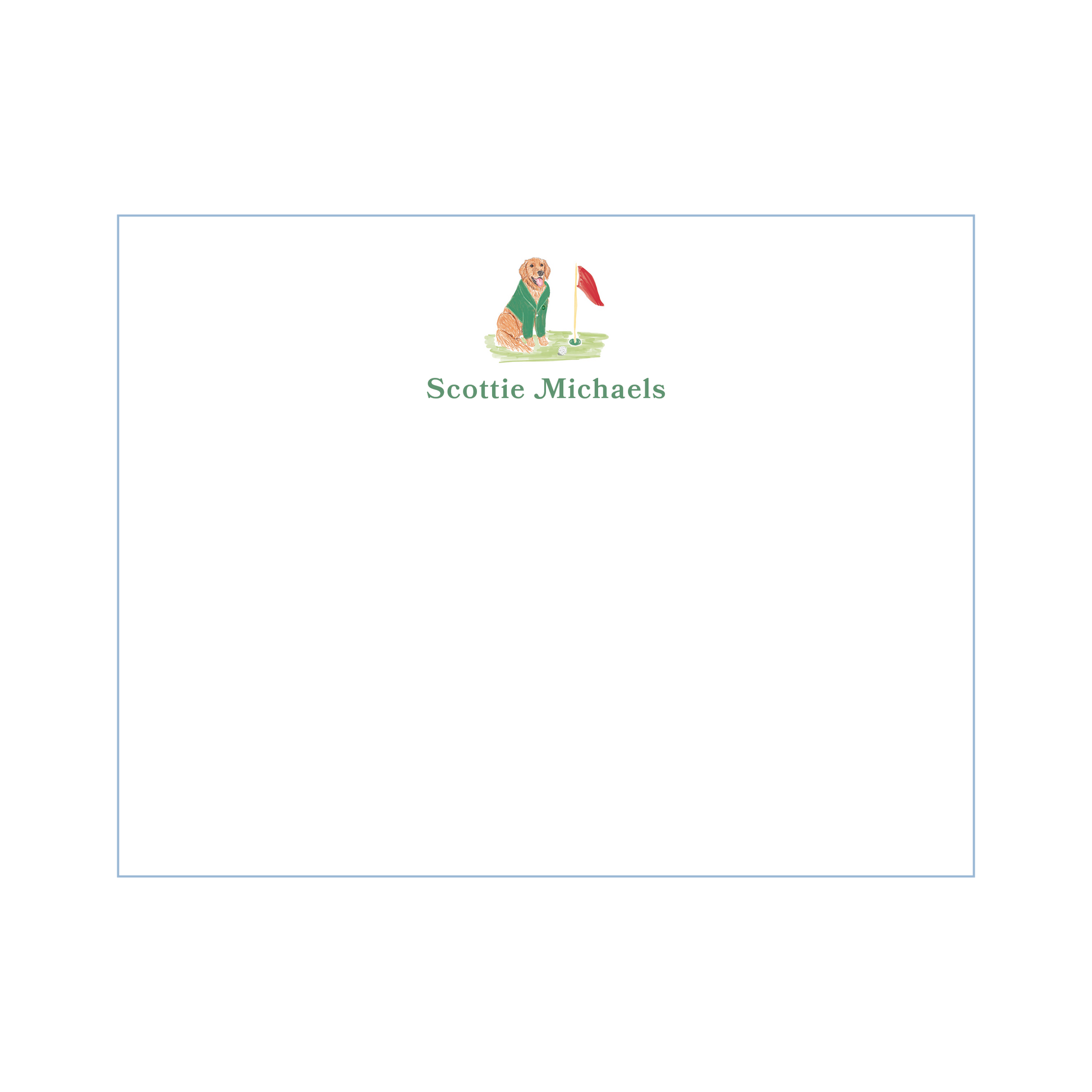 Best friends have fur! Commemorate the friendship between your dog and toddlers with this puppy notecard. Golden Retriever mastering golf in a green jacket.