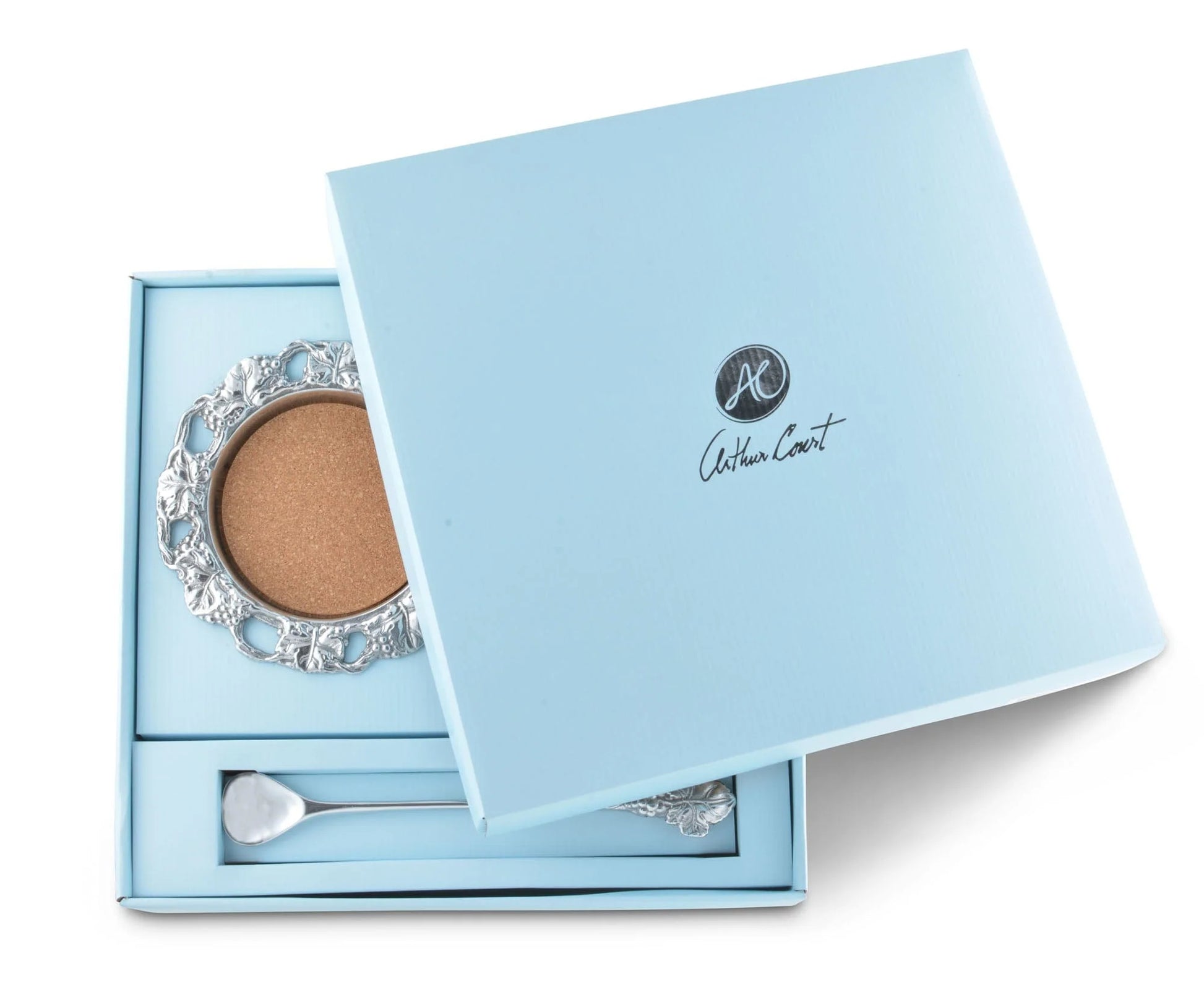 Leaves, vines and bundles of grapes combine to form the piece's openwork base, while a similar motif forms the stirring ladle's handle. The handmade, aluminum design displays a brilliant luster against the glass and removable, cork coaster.