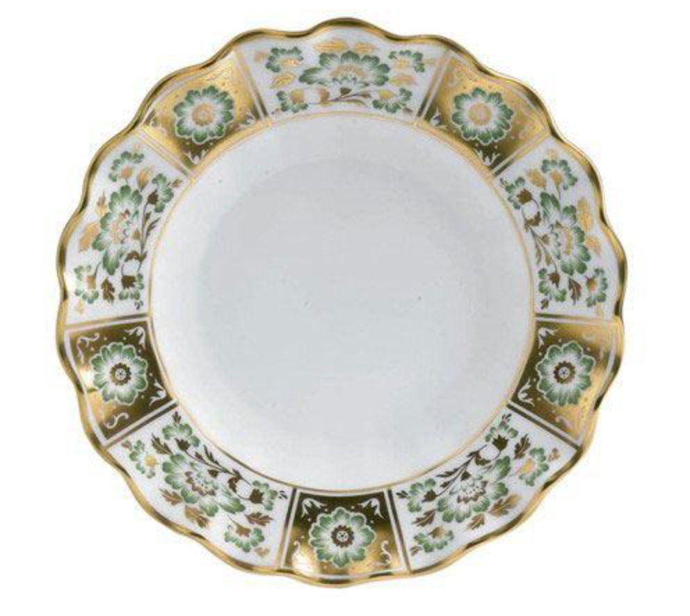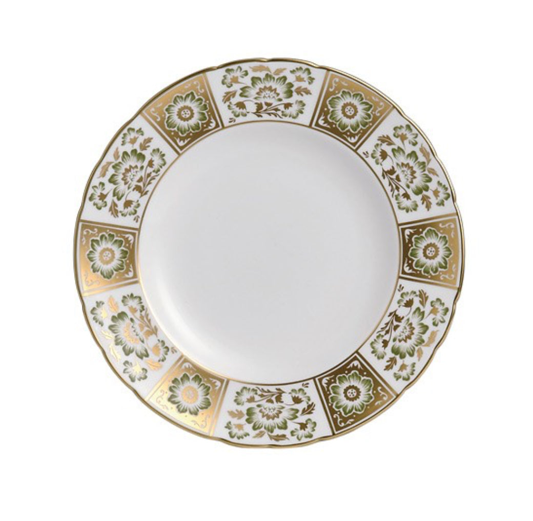 Darley Abbey captures the style of restrained simplicity using delicate lines and intricate curves representing twirling foliage and filigree leaves combined with 22 karat gold on a soft green silk damask background over white bone china. Handmade in England.