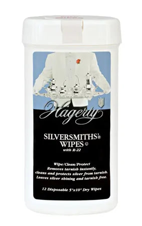Hagerty Silversmiths’ Wipes instantly wipe away tarnish from sterling, silver plate, and gold. Each dry, disposable wipe leaves silver shining and tarnish free. Contains R-22, Hagerty’s exclusive tarnish preventative that locks out tarnish ten times longer! Great for last minute touch ups or routine dusting. Contains twelve 5"x10" wipes.