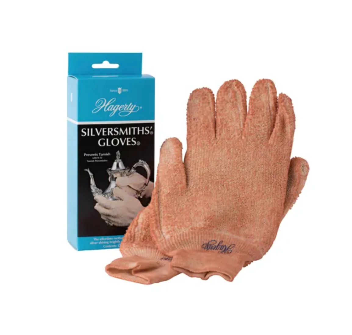 Hagerty Silversmiths’ Gloves clean, polish, and prevent tarnish on sterling, silver plate, and gold while hands stay dry and unsoiled. Made of heavy-gauge terry cloth, these gloves can withstand scores of washings. Contains R-22, Hagerty’s exclusive tarnish preventative that locks out tarnish ten times longer!