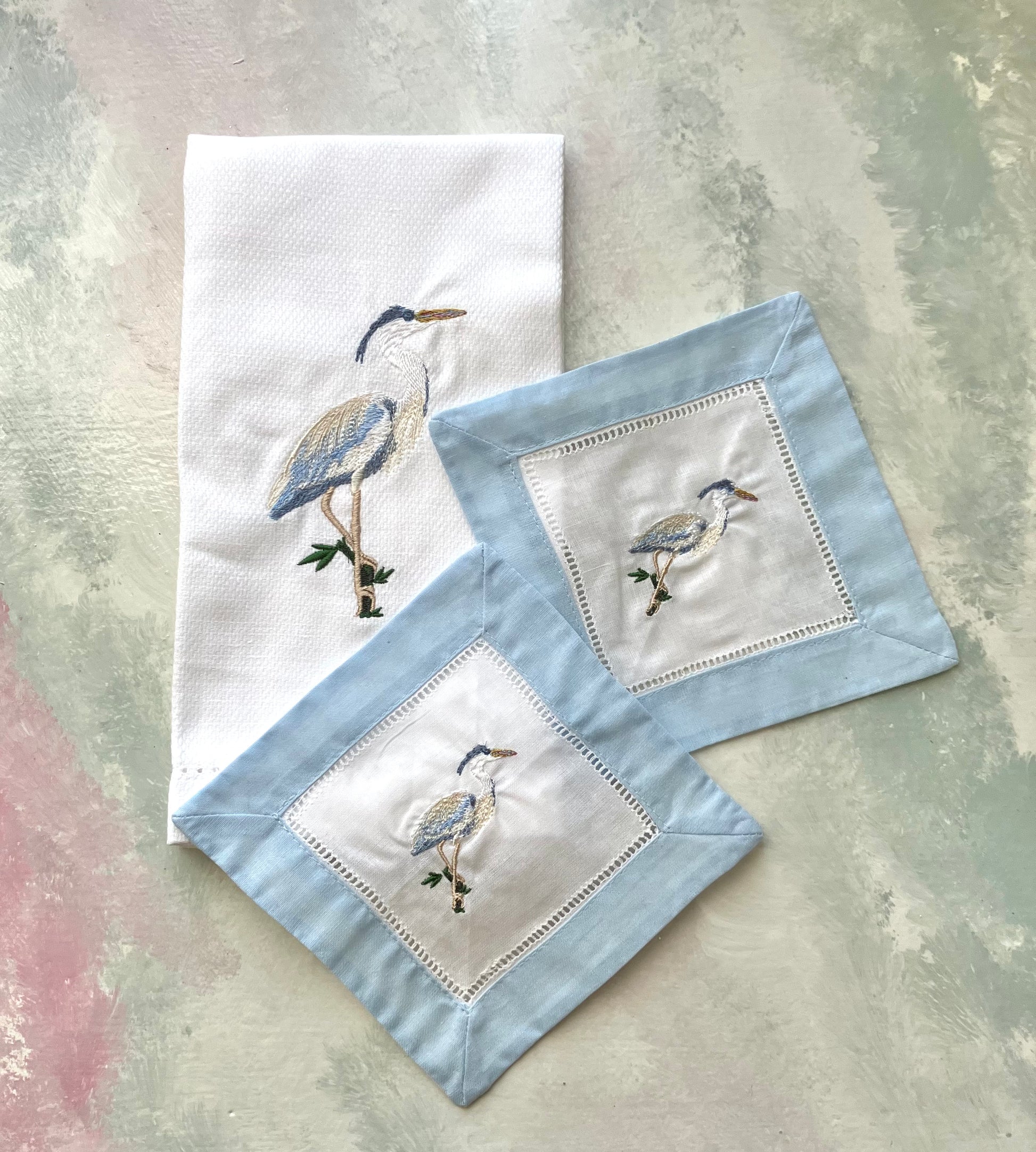Elevate your kitchen charm with the Heron Tea Towel & Napkin Set, featuring a beautifully embroidered heron that brings a touch of whimsy to your linen collection. Perfect for drying dishes or adding flair to your cocktail hour, these soft, durable linens blend practicality with playful elegance. Whether you're entertaining guests or enjoying a quiet moment, this set adds a splash of nature-inspired delight to every occasion.