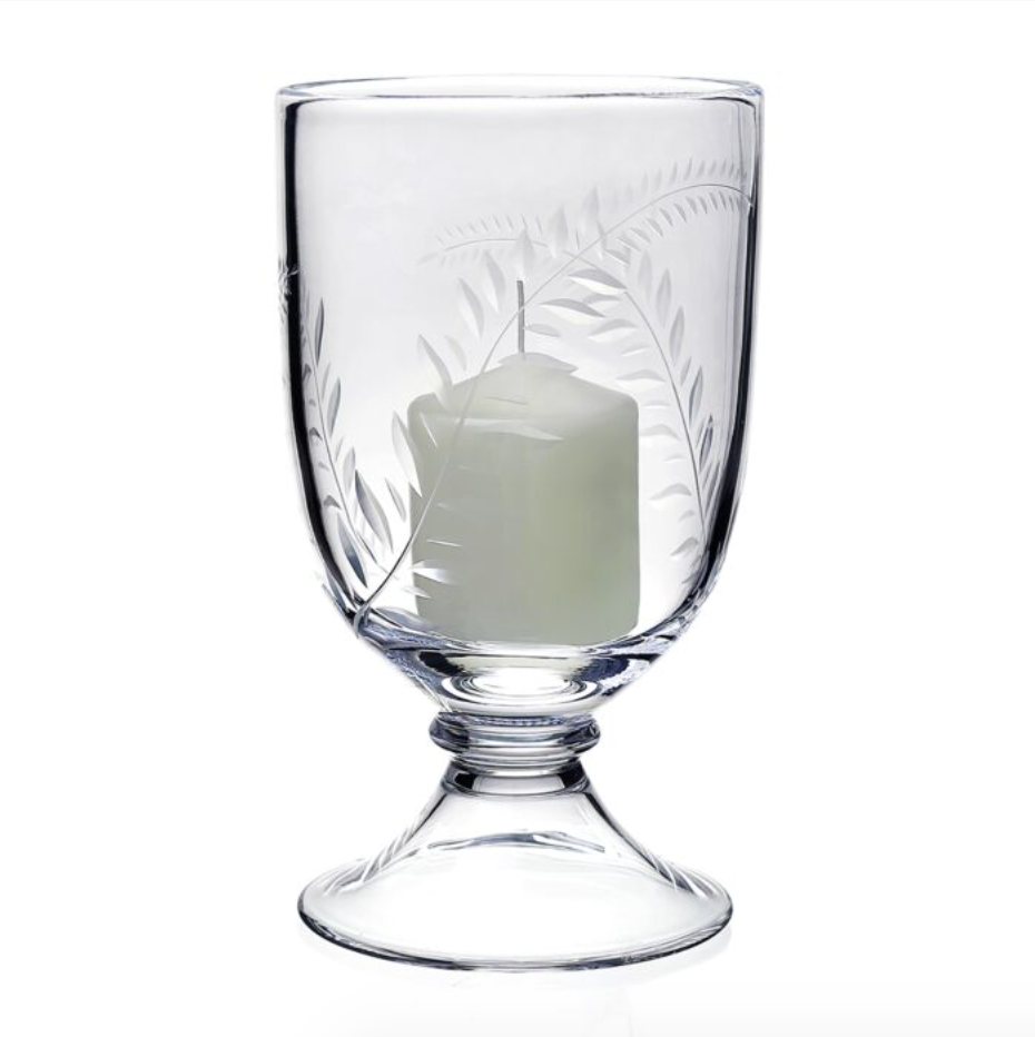 The Jasmine Footed Hurricane is lovely with candlelight but is equally happy with some wonderful flowers in it. Hand engraved with the Jasmine Vine design.