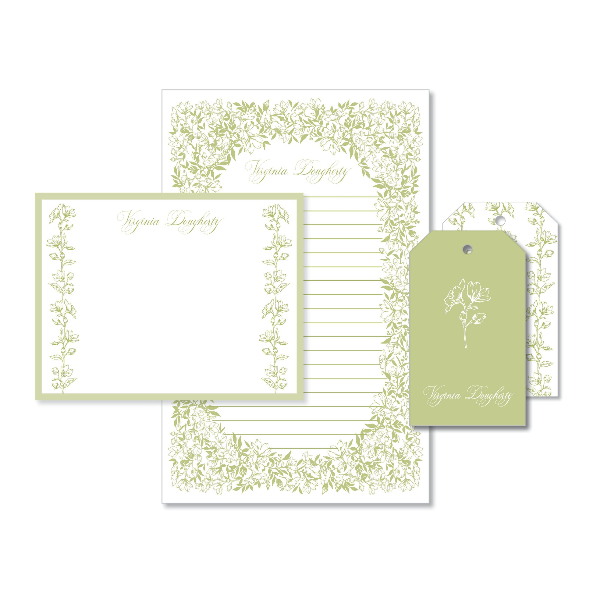 Medium set includes: 15 notecards (5.5x4.25") with envelopes, 16 gift tags (2.375x4”), 1 notepad (5.5x8.5” with 50 sheets), and 15 stickers (3” square)
