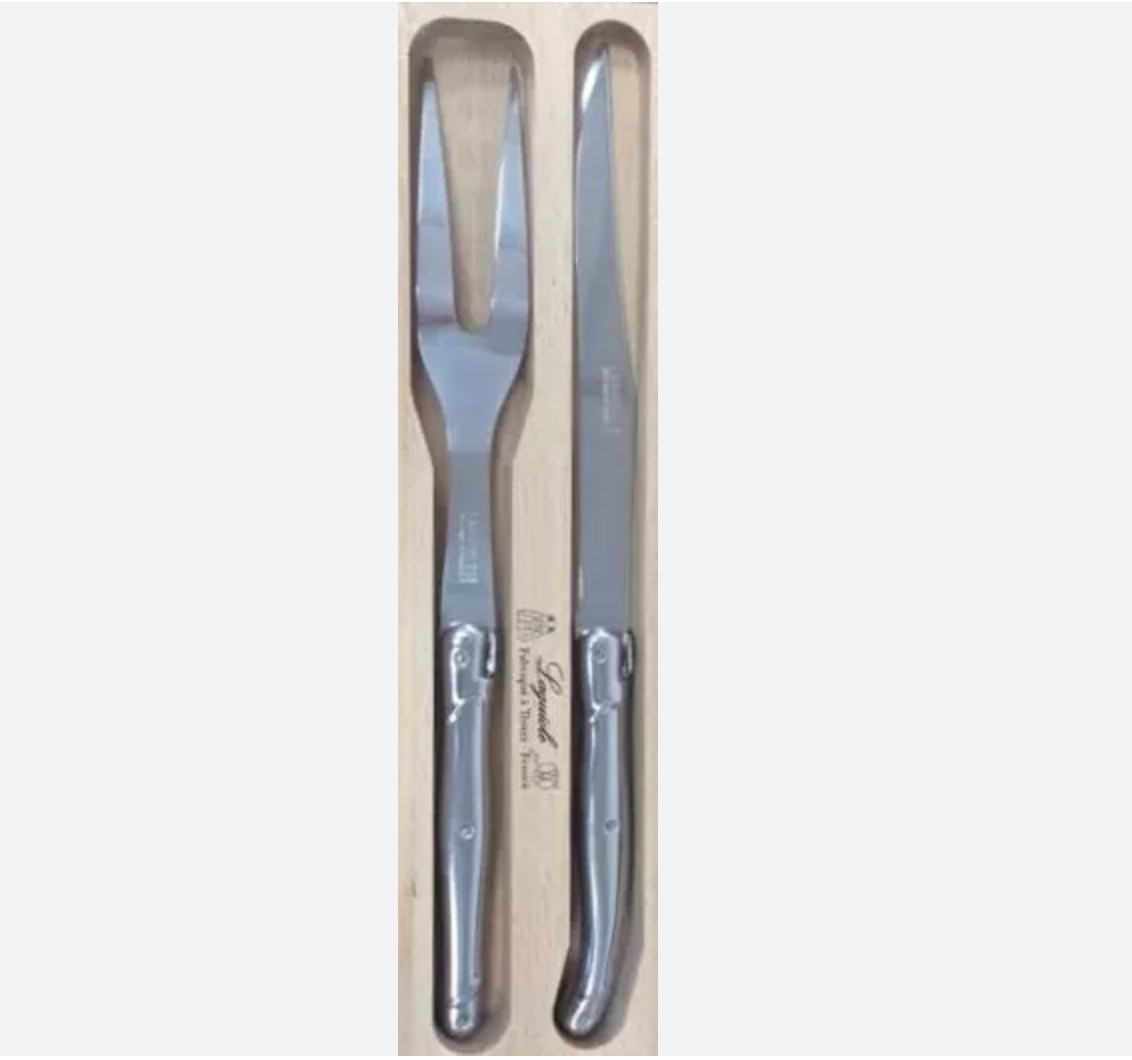 Knives that are fit for a king! Laguiole is where Napoleon's favorite knives were made. This region is world renowned for its beautiful flatware that is hand made. The Laguiole debutant, carving set is stainless steel, engraved with the words LAGUIOLE 100% Made in France and the iconic Laguiole bee on each piece.