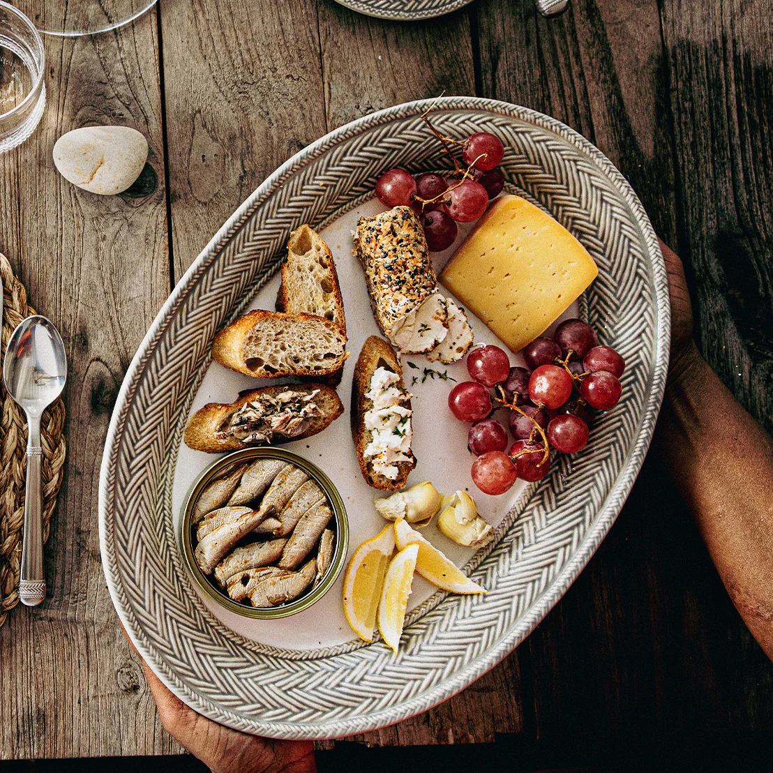 The large scale of this basket-weave motif instantly evokes the bounty of the earth and echoes of its harvest. Richly textural and featuring a handsome, hand-painted grey wash trim, this platter will serve up your superstar dishes with elegant ease.