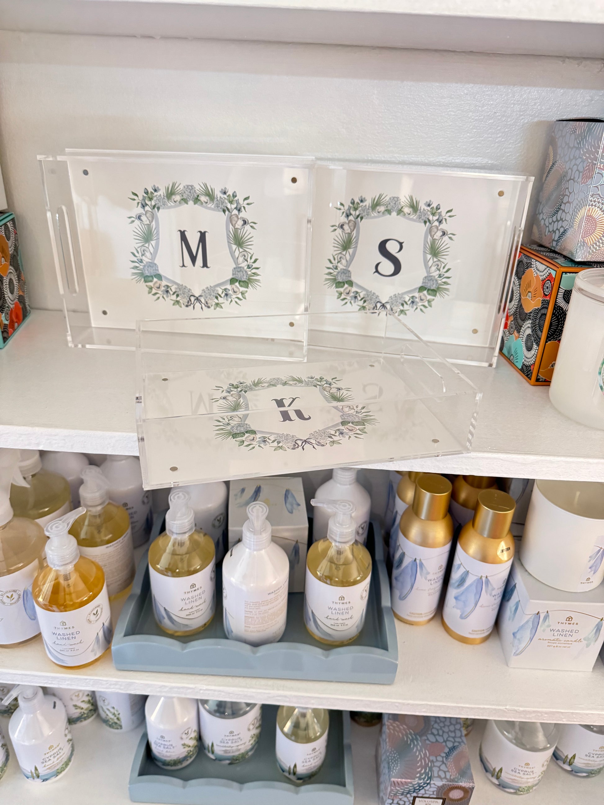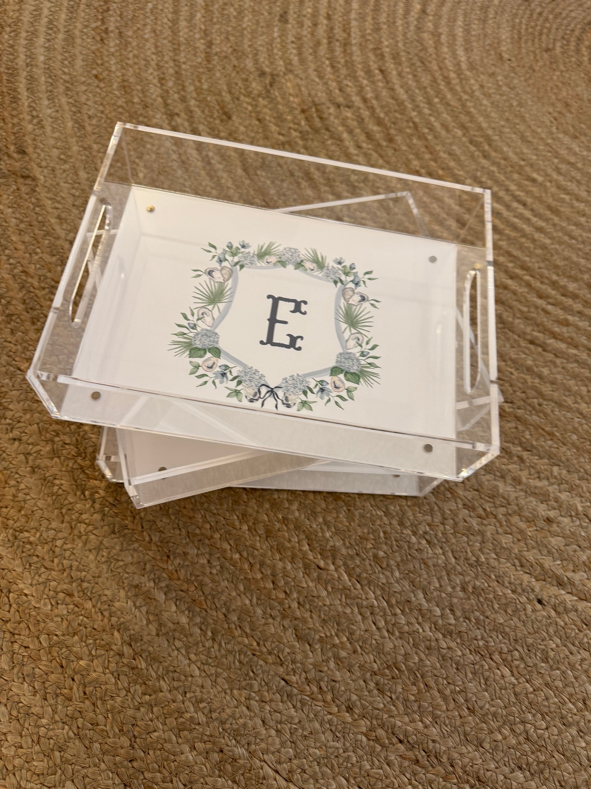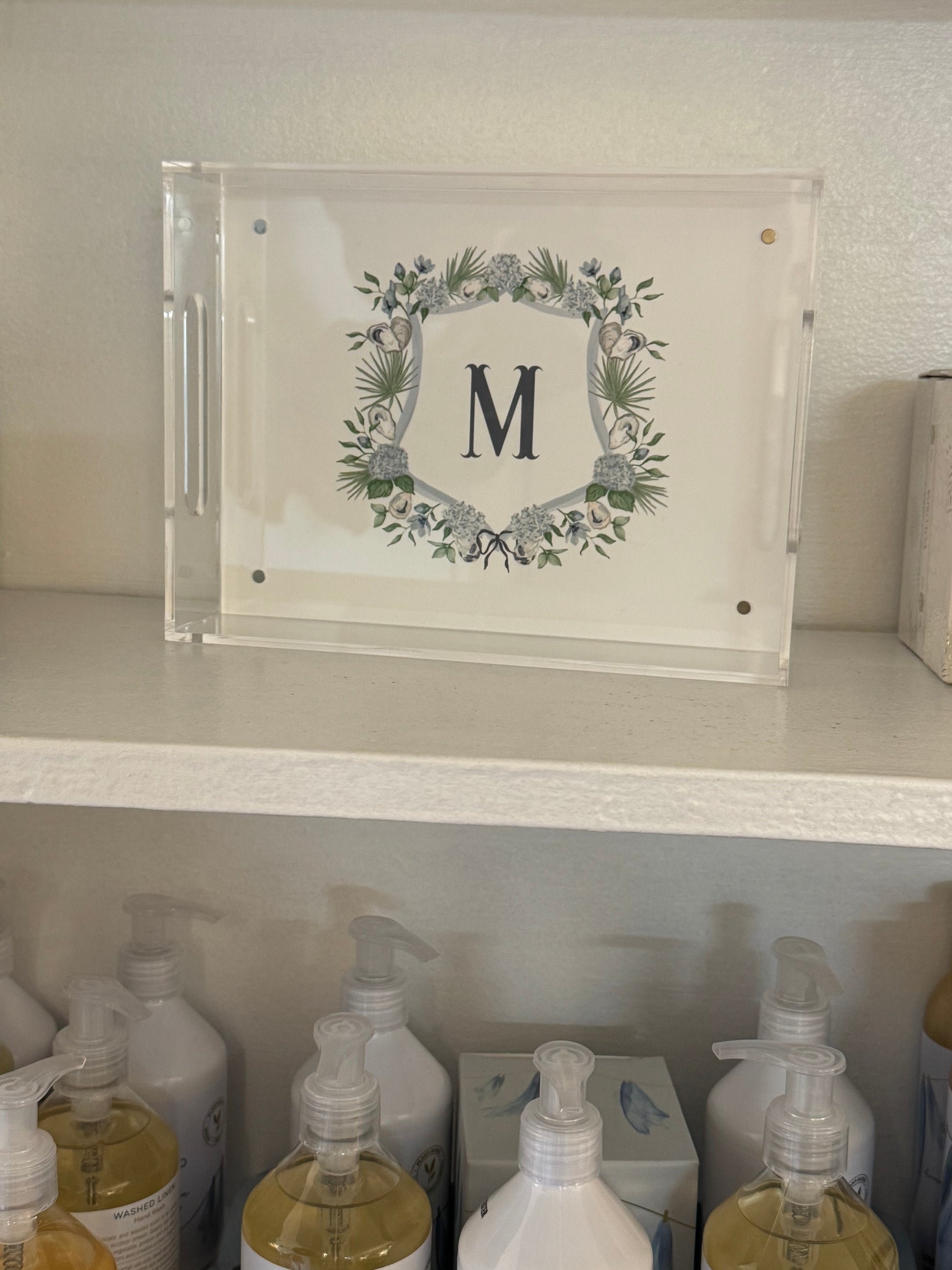 Exclusive low country crest designed by Hayley featuring oysters, palm fronds, and hydrangeas with a single initial. Swap out photos or invitations for a change!