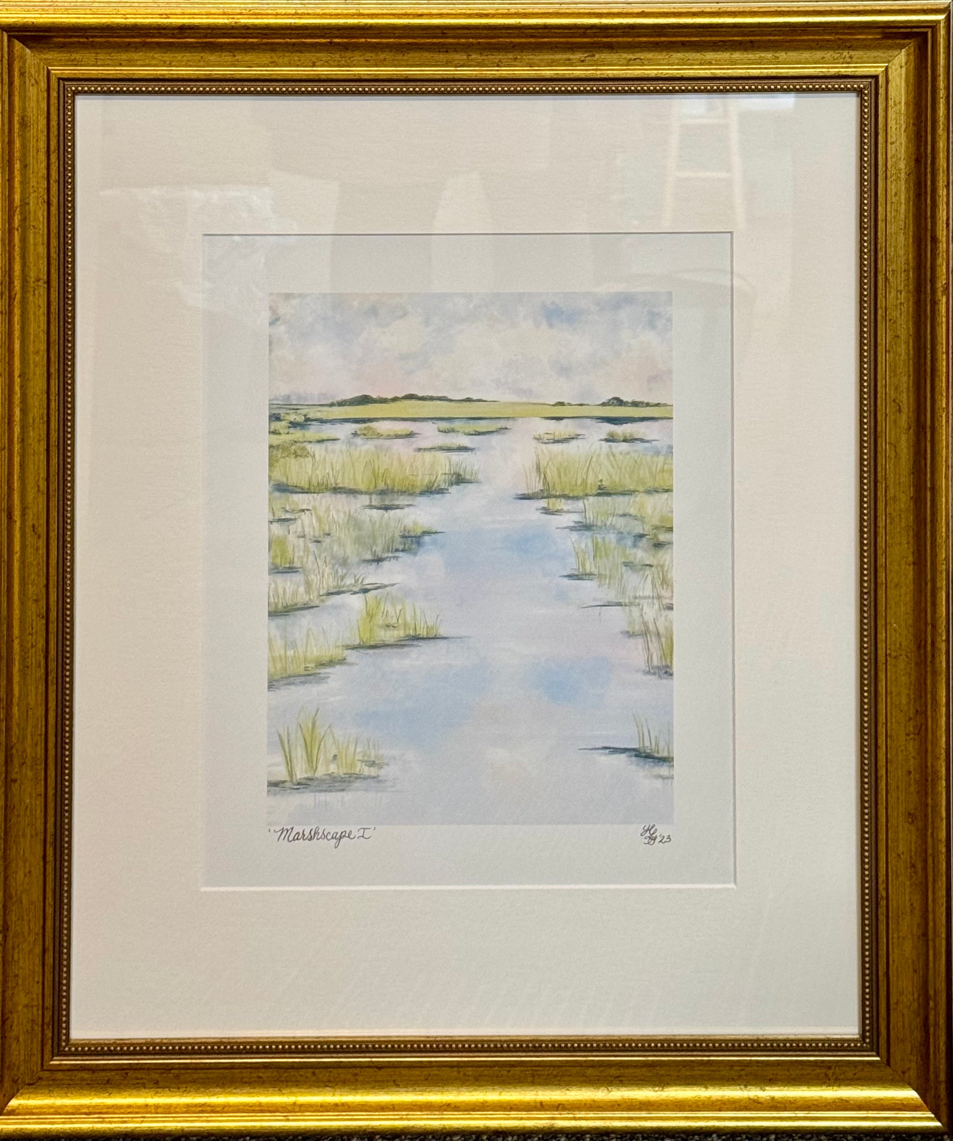 From the Hayley Lane Suthers Collection, her very first marsh captured in pastels, “Marshscape I" utilizes a cotton candy color palette under a fluffy clouds with pops of pink!