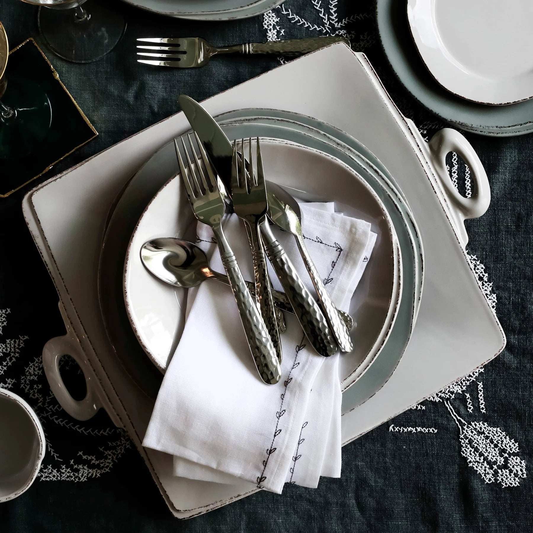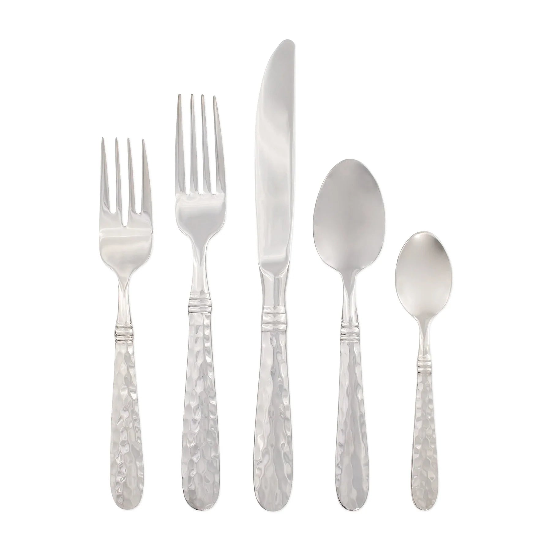 Italian artisans forge each piece of the Martellato Five-Piece Place Setting thus adding hammered detail. The 18/10 stainless steel combined with years of craftsmanship result in a well-balanced, weighty flatware. This hammered flatware set is made in Lumezzane, Italy, by the Bugatti family.