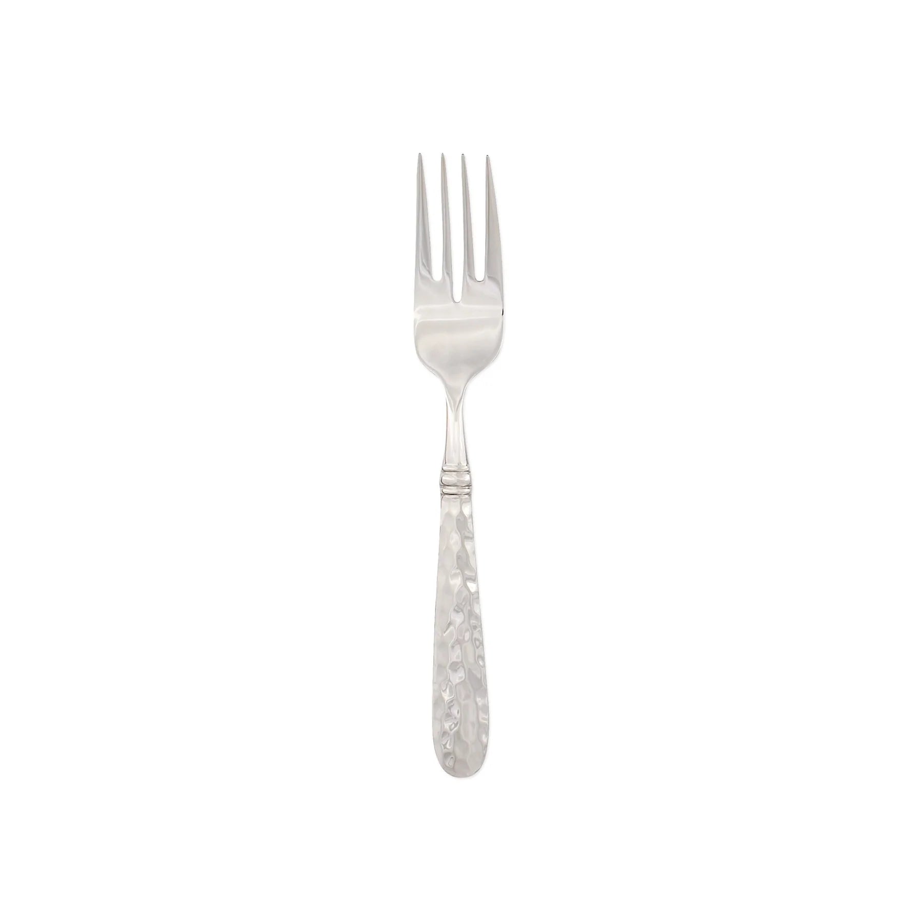 Italian artisans forge the Martellato Salad Fork thus adding hammered detail. The 18/10 stainless steel combined with years of craftsmanship result in a well-balanced, weighty flatware. This hammered flatware set is made in Lumezzane, Italy, by the Bugatti family.