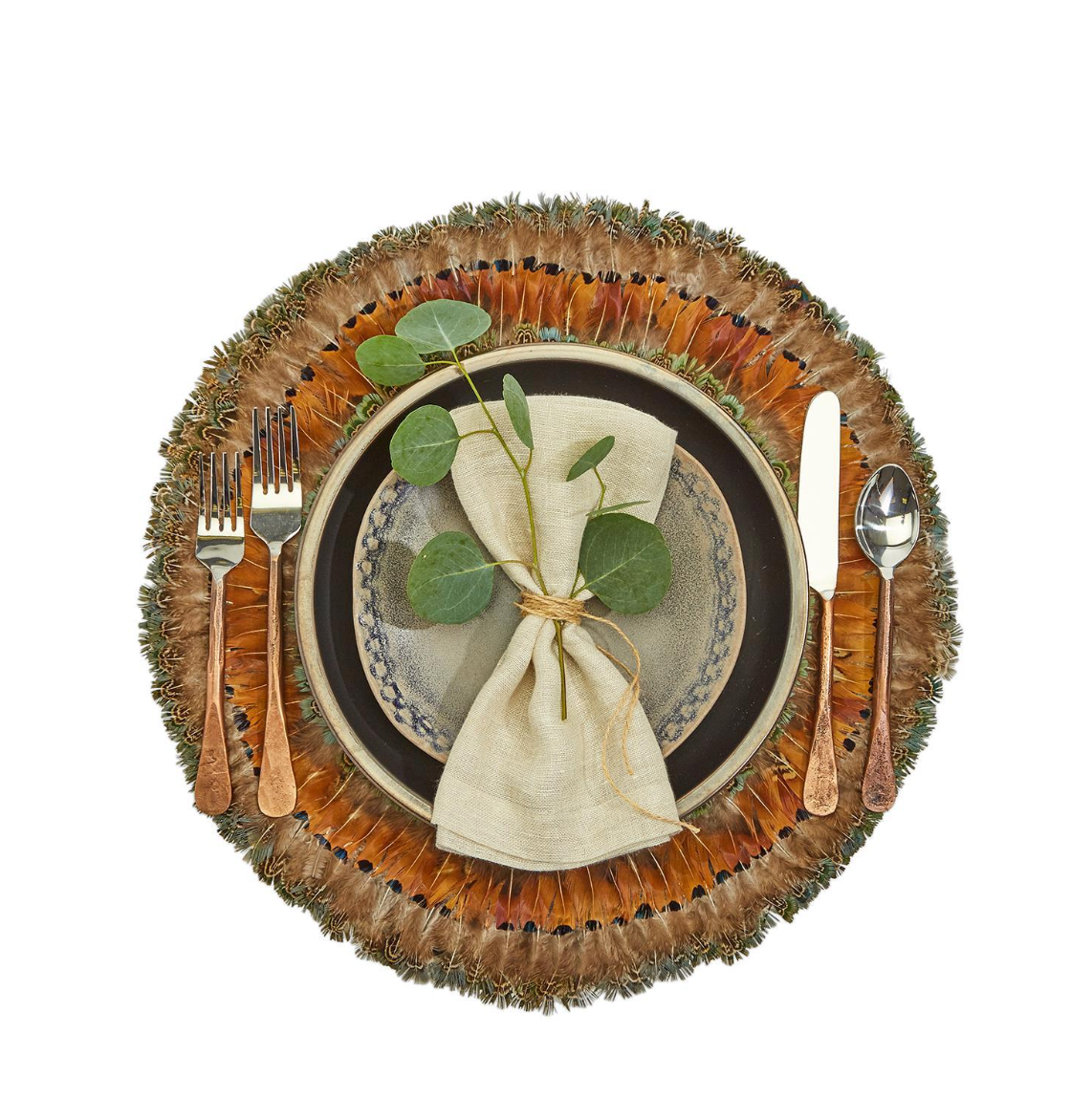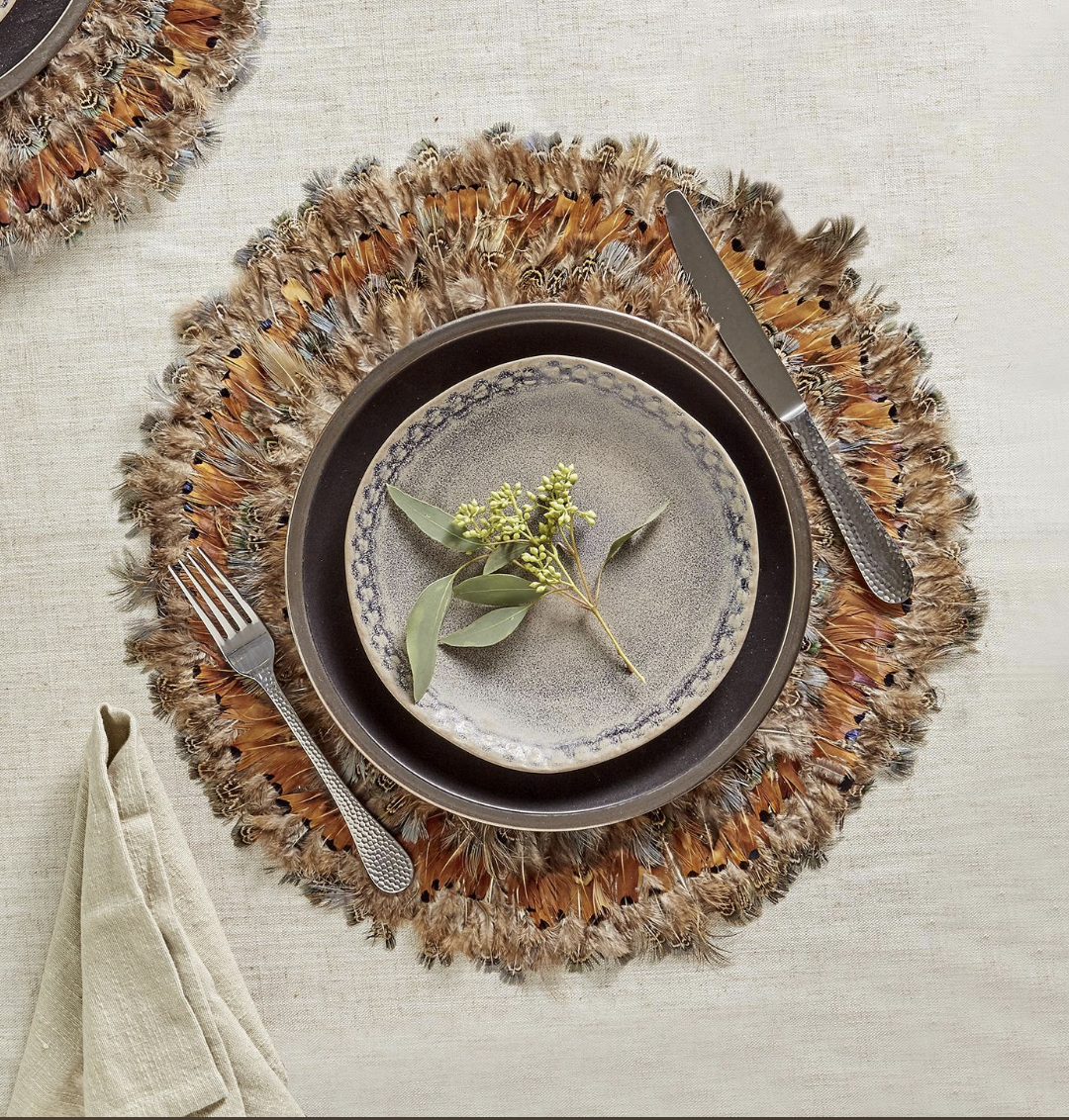 Classic hand-crafted feather placemat. Each feather hand placed to showcase beauty of these feathers