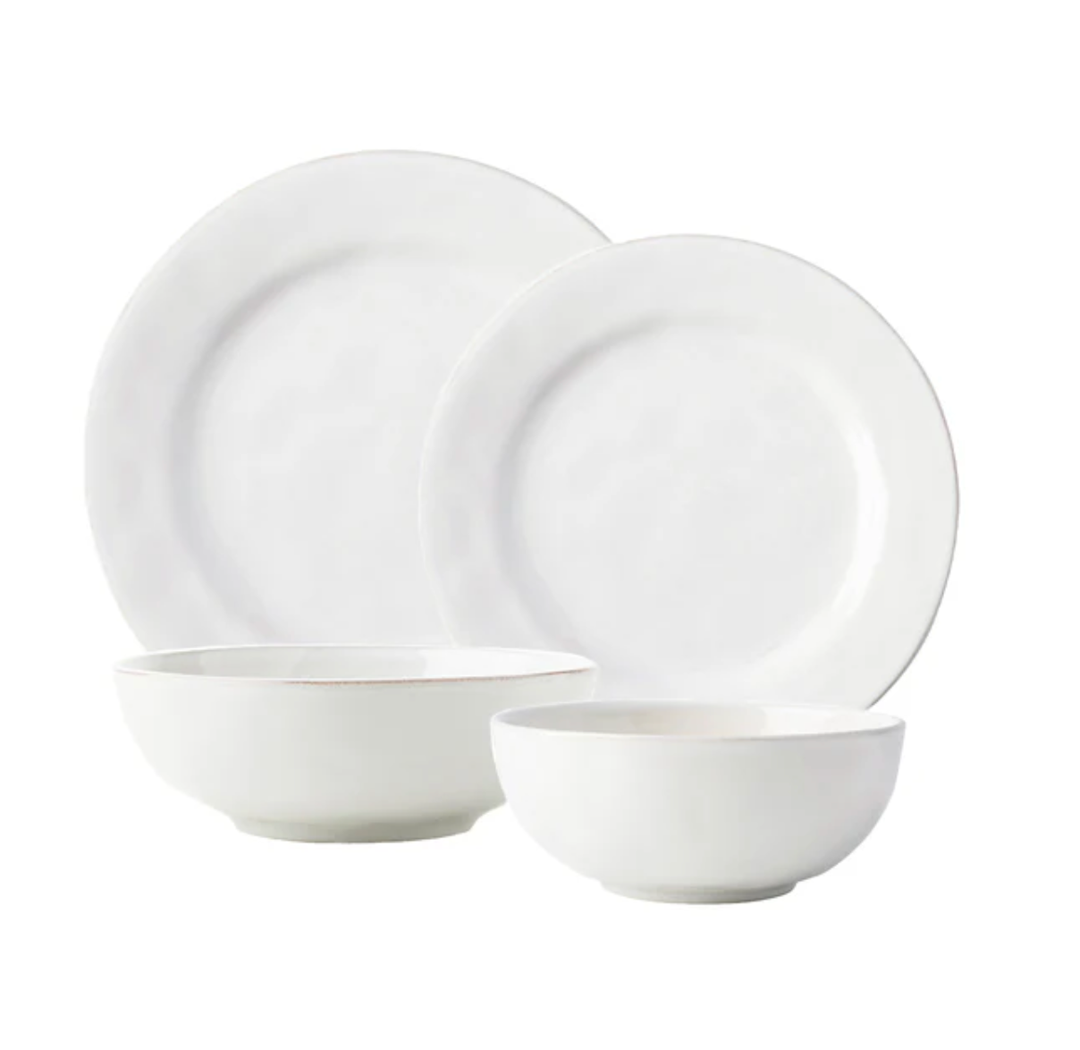 4 Piece: Four piece setting includes Dinner Plate, Dessert/Salad Plate, Cereal/Ice Cream Bowl and Coupe Bowl.