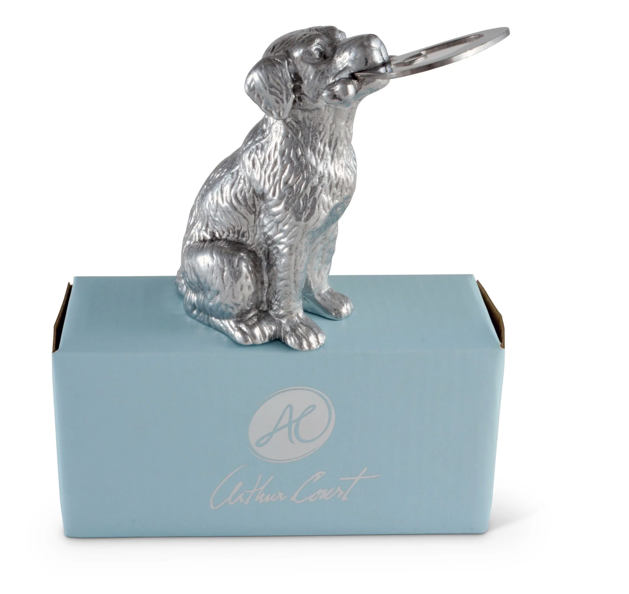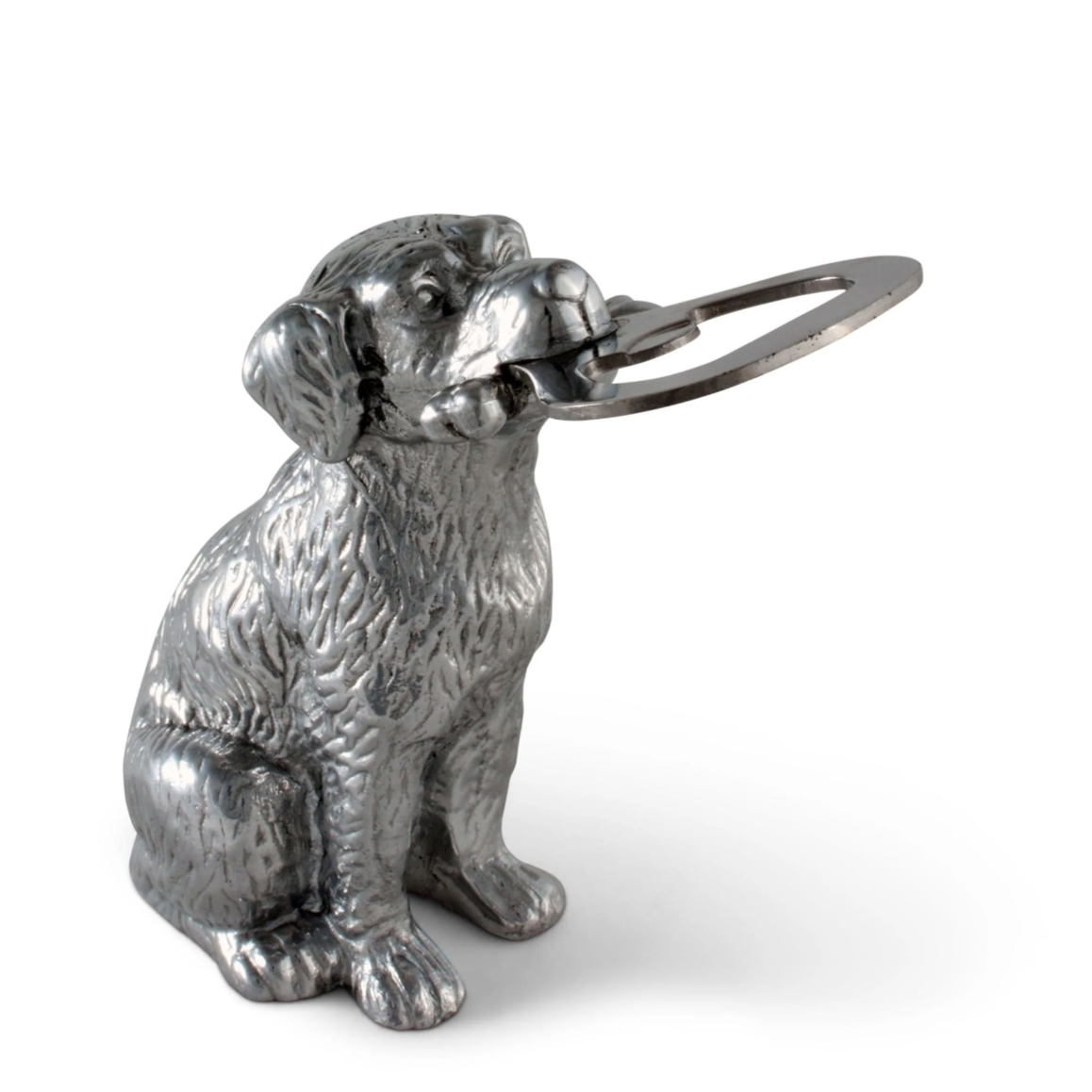 Balancing both a bone and the opener in its mouth, an exquisite labrador waits patiently to be used by its owner. The intricate markings in its coat exhibit the striking detail of this handmade, aluminum statuette.