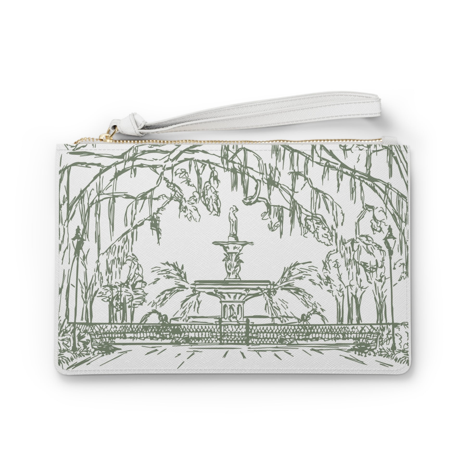 Forsyth Fountain pouch bag in various color ways. Perfect for parties, luncheons, or a breezy low country boil, this velvet wristlet adds a splash of charm to any outfit. With a stylish gold zip closure and a removable handy wristlet, it fits your daily essentials—phone, wallet, lipstick, sunglasses—while keeping your hands free.