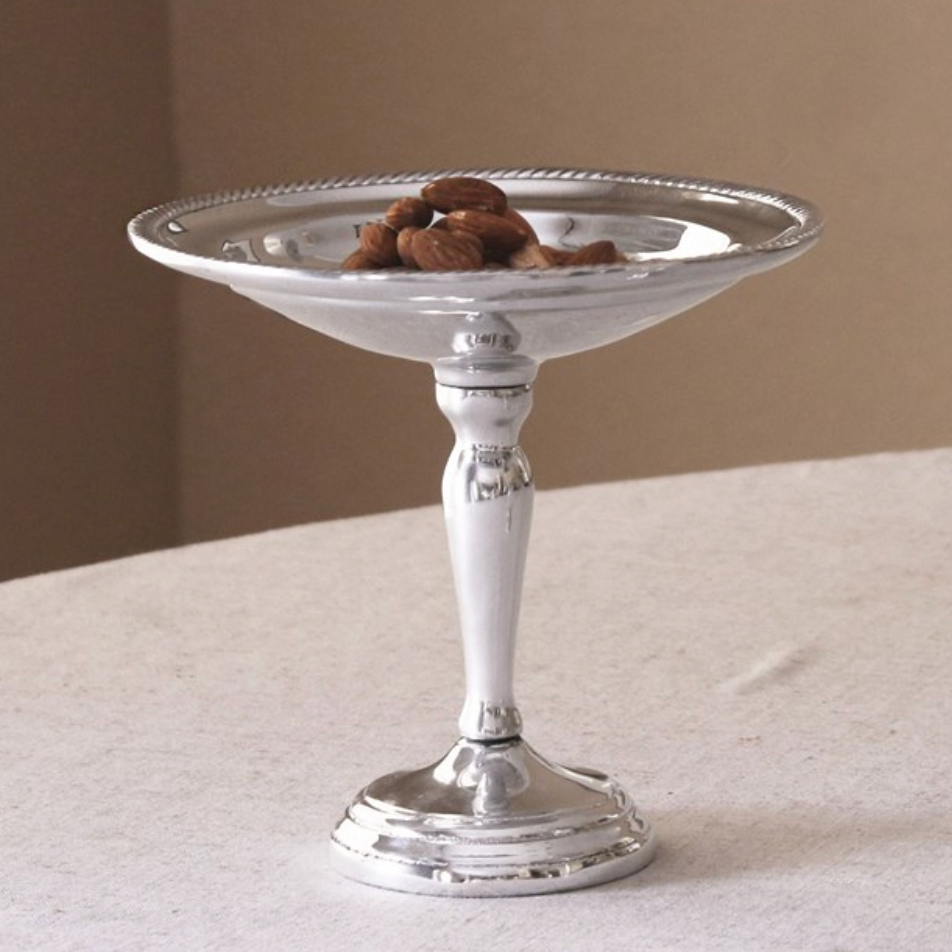 Description: Vintage inspired! Based an heirloom from Beatriz's personal collection, our SOHO Gallones Pedestal is a great new item from Beatriz Ball's bestselling SOHO Collection of signature metalware. Presented in polished metal with the look of silver, this piece has a classic look with vintage styling. It has clean lines, symmetrical design, and is rimmed with a subtle Gallones pattern. Perfect for serving nuts, candies and other snacks or desserts. An exquisite compote with a retro feel is a perfect addition to anyone's home décor. Also available in a medium size. An original Beatriz Ball design sustainably handmade of an FDA safe, easy-care, oven and freezer friendly aluminum alloy.