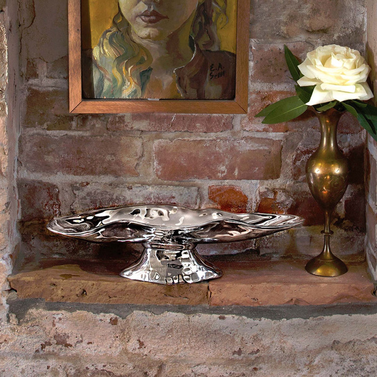 Elevated elegance.Our lovely PEDESTAL Soho ovl Tray is a contemporary classic with a hint of the ancient in its intensely handmade form.Sandcast of gleaming metal, this silver tray makes a stunning statement filled with crackers, olives, or flowers; looks great on the mantle, too!Perfectly proportioned, the piece works with any Beatriz Ball SOHO items.Made of an FDA safe, easy-care 93% aluminum alloy.