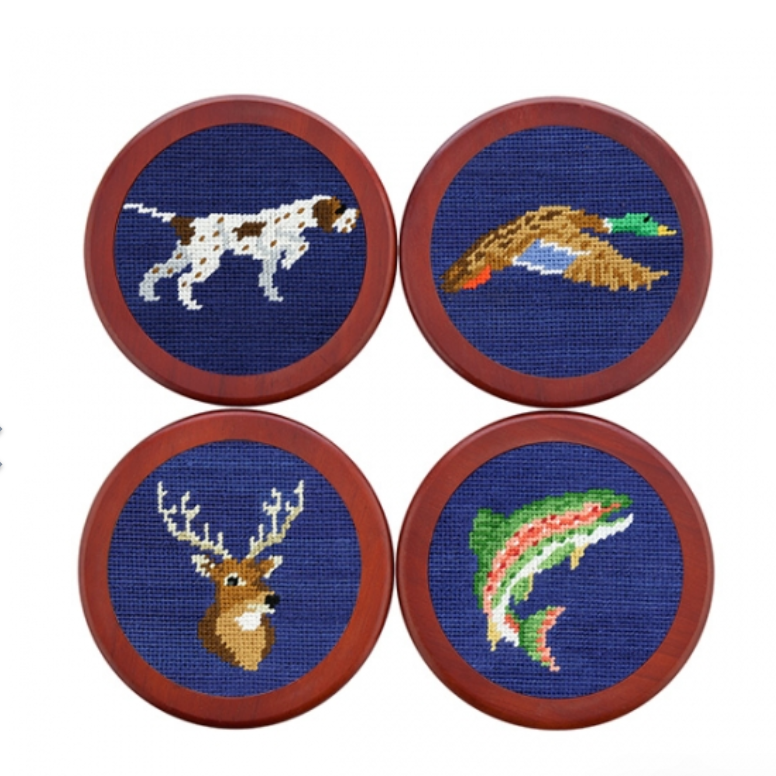 Packaged in sets of four within a polished wooden holder, our needlepoint coasters are a great addition to any coffee table or living room!