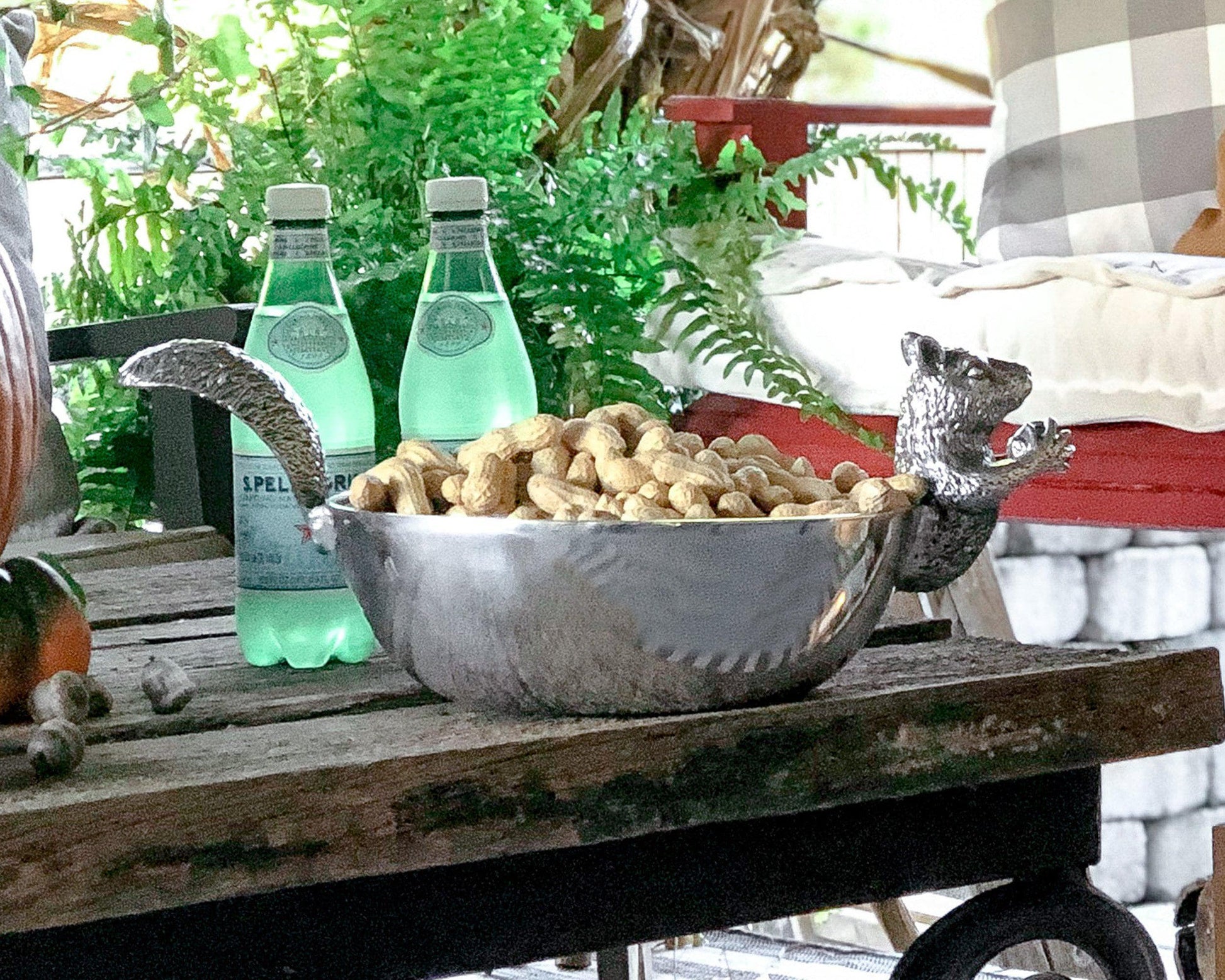 As if begging for just one more nut, this adorable squirrel pushes its hands together in prayer at the front of this piece. The animal's wide, bushy tail features intricate markings of hair as it extends from the back rim of this handmade, aluminum bowl.