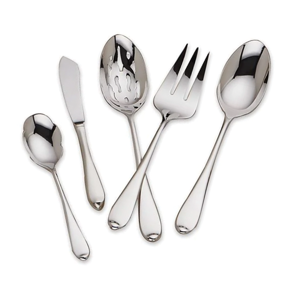The Studio Serving Set by Gorham exhibits a sleek design with classic teardrop handles. This elegant design showcases the flatware's polished 18/10 stainless steel. This flatware coordinates with casual and formal dinnerware, and includes 1 serving spoon, 1 pierced serving spoon, 1 butter knife, 1 sugar spoon, and 1 serving fork.