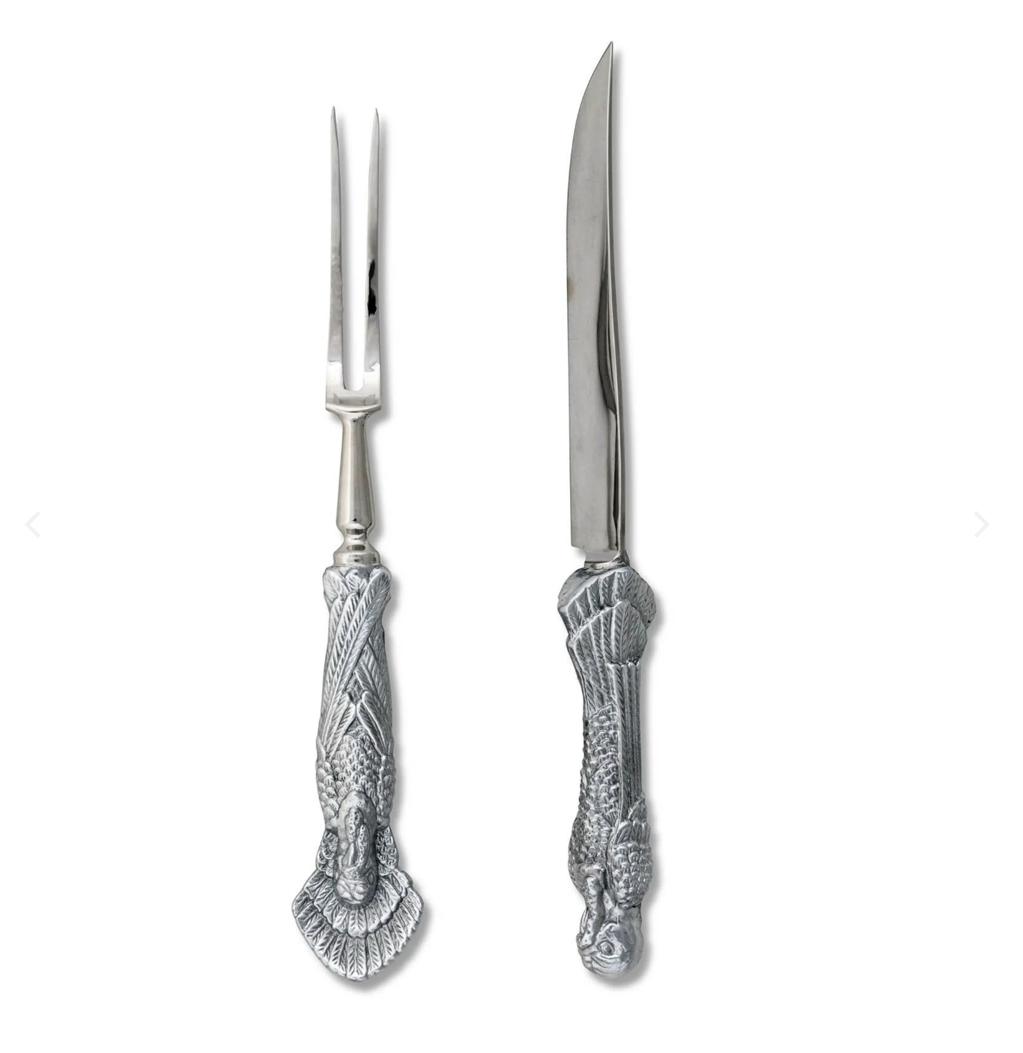 Arthur Court's unique Thanksgiving carving set features a profile of the great fowl with detailed and variegated feathers cast in signature Arthur Court aluminum alloy. The fork tine head and knife blade are high quality forged stainless steel crafted to