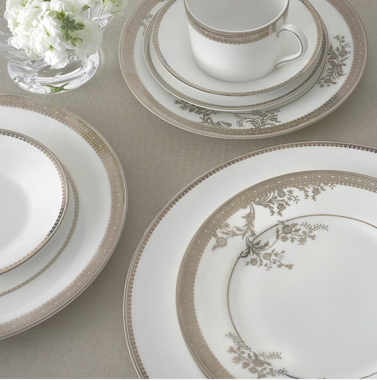 Inspired by the brightly hued corsages from renowned New York designer Vera Wang's bridal collection, the Lace Collection is characterized by understated elegance. Decorated with a refined pattern that weaves together a unique combination of tailored lace bands and delicate florals ; bringing a touch of gold to any dining occasion.